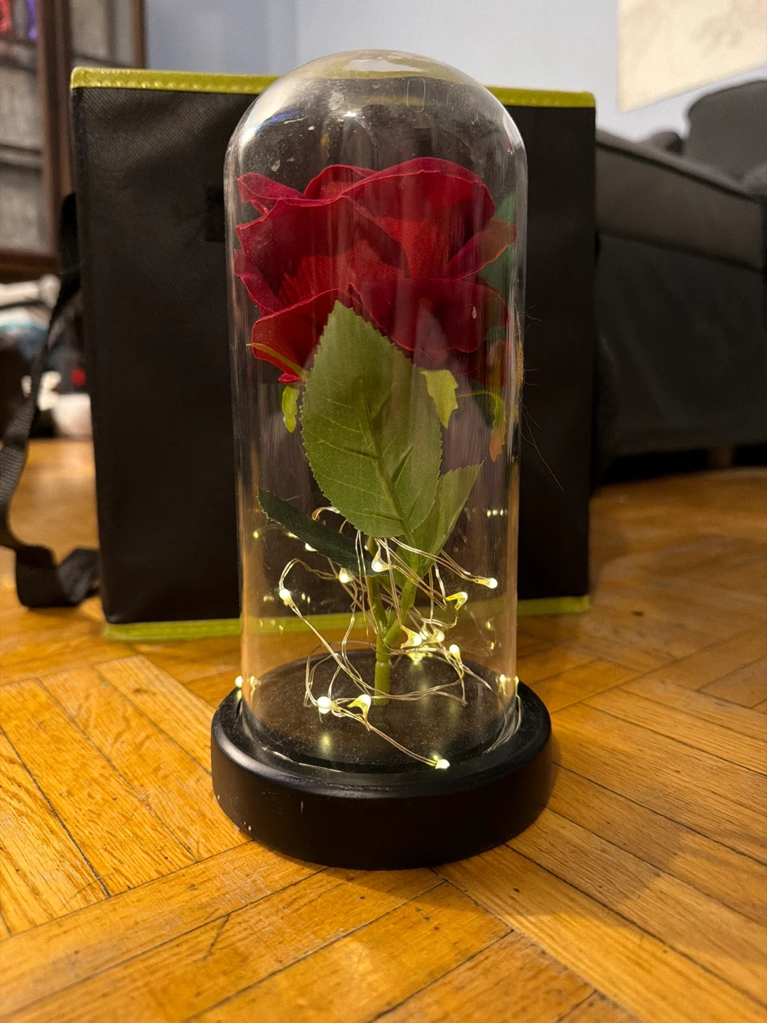 Selling a beautiful enchanted rose flower lamp! It features a red rose under a glass dome with fairy lights. Perfect for adding a touch of magic to any room! Comes with the original box.