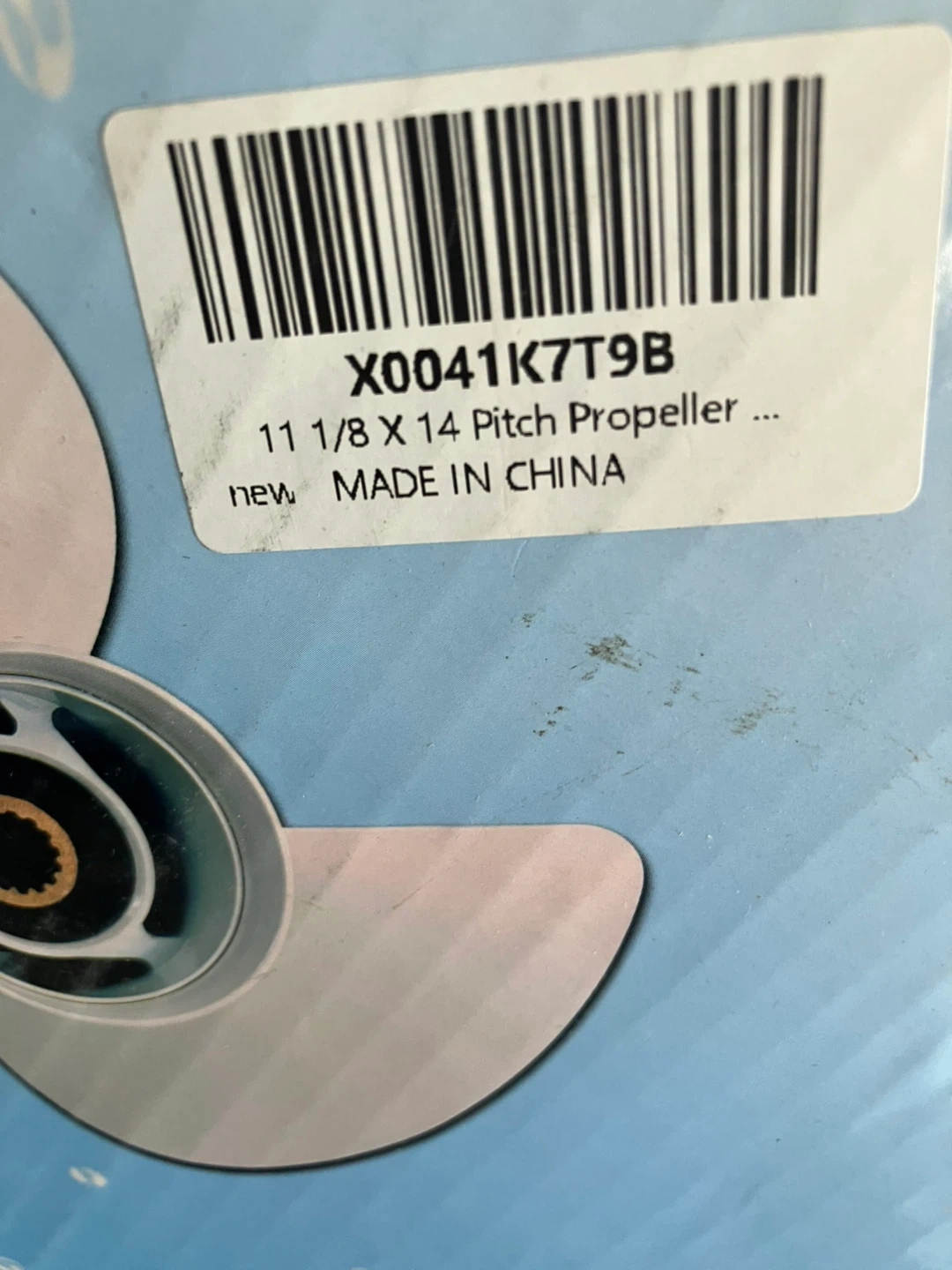 This is a new outboard engine propeller. It's a 11 1/8 x 14 pitch propeller, made in China. It comes in its original box. This propeller is suitable for outboard engines needing these specific dimensions.