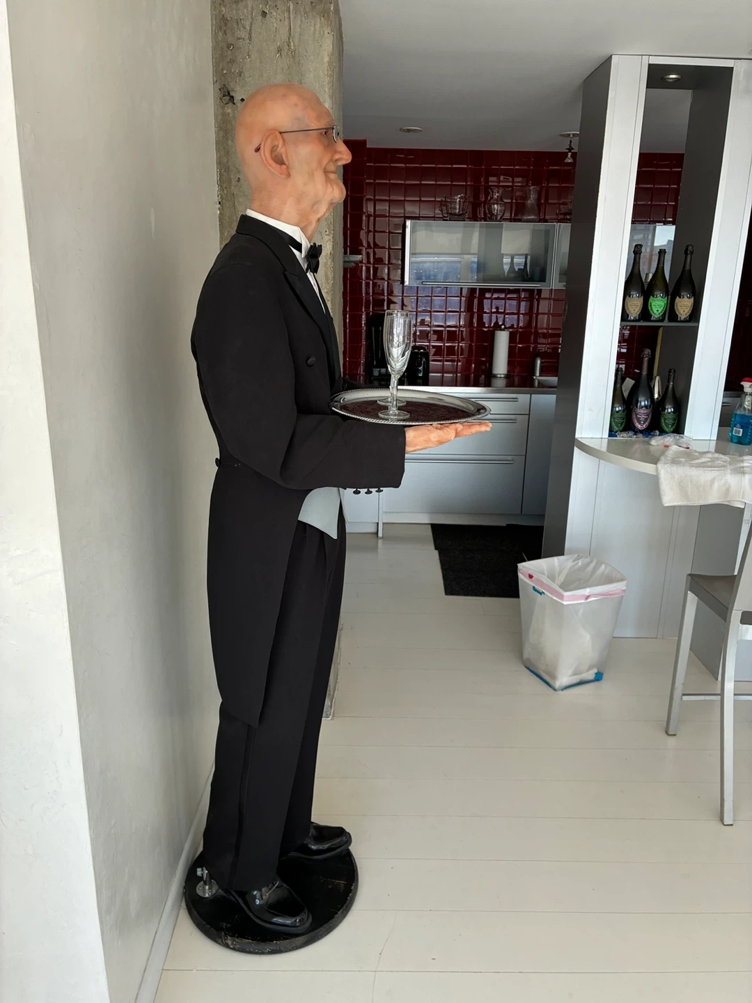 This life-size butler mannequin is dressed in formal attire. It's a striking decorative piece--ideal for a home bar or entertainment area. "Haynes" stands on a sturdy base for stability. People swear he is real.