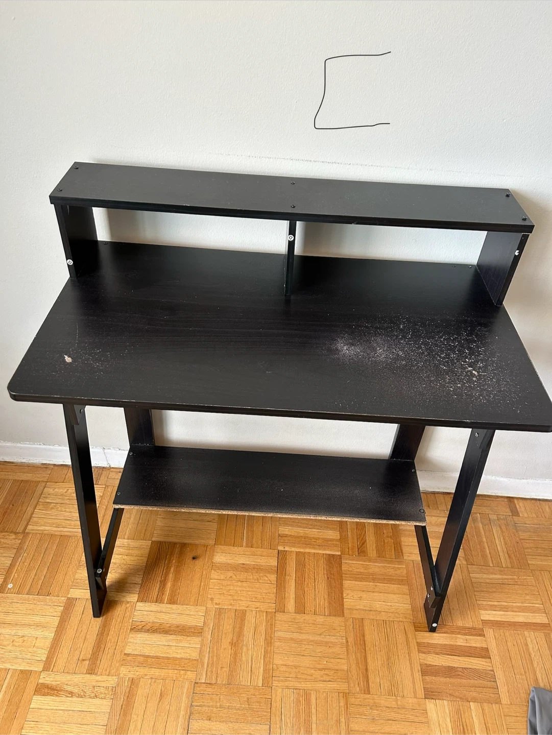 Selling a black desk that comes with built-in shelves. It's perfect for a small office or study space. There are some signs of use, as shown in the pictures.