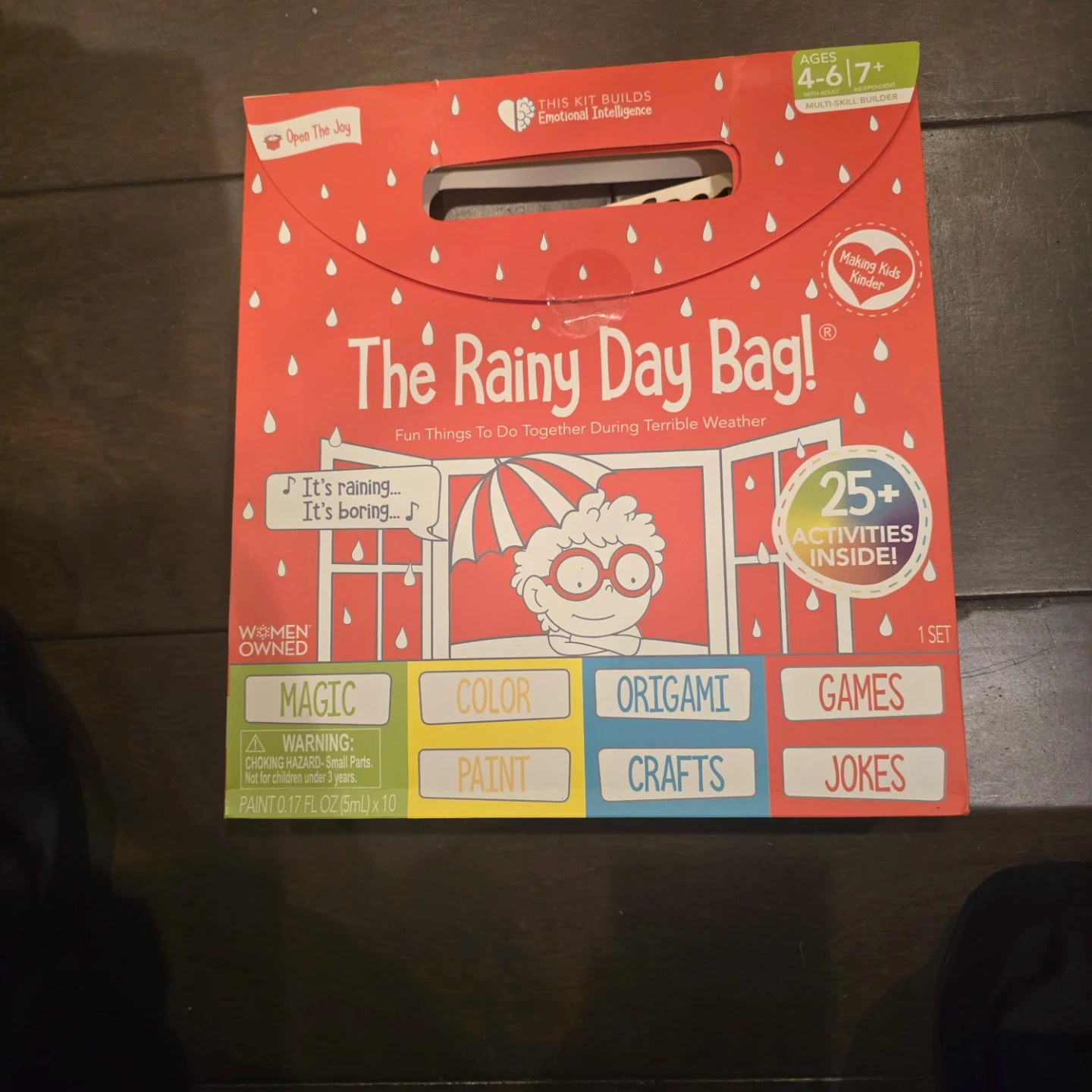 This kit builds emotional intelligence and offers over 25 activities for kids ages 4-7+. Includes magic, color, paint, origami, crafts, games, and jokes. Ten paint pots included, each 0.17 fl oz (5mL).