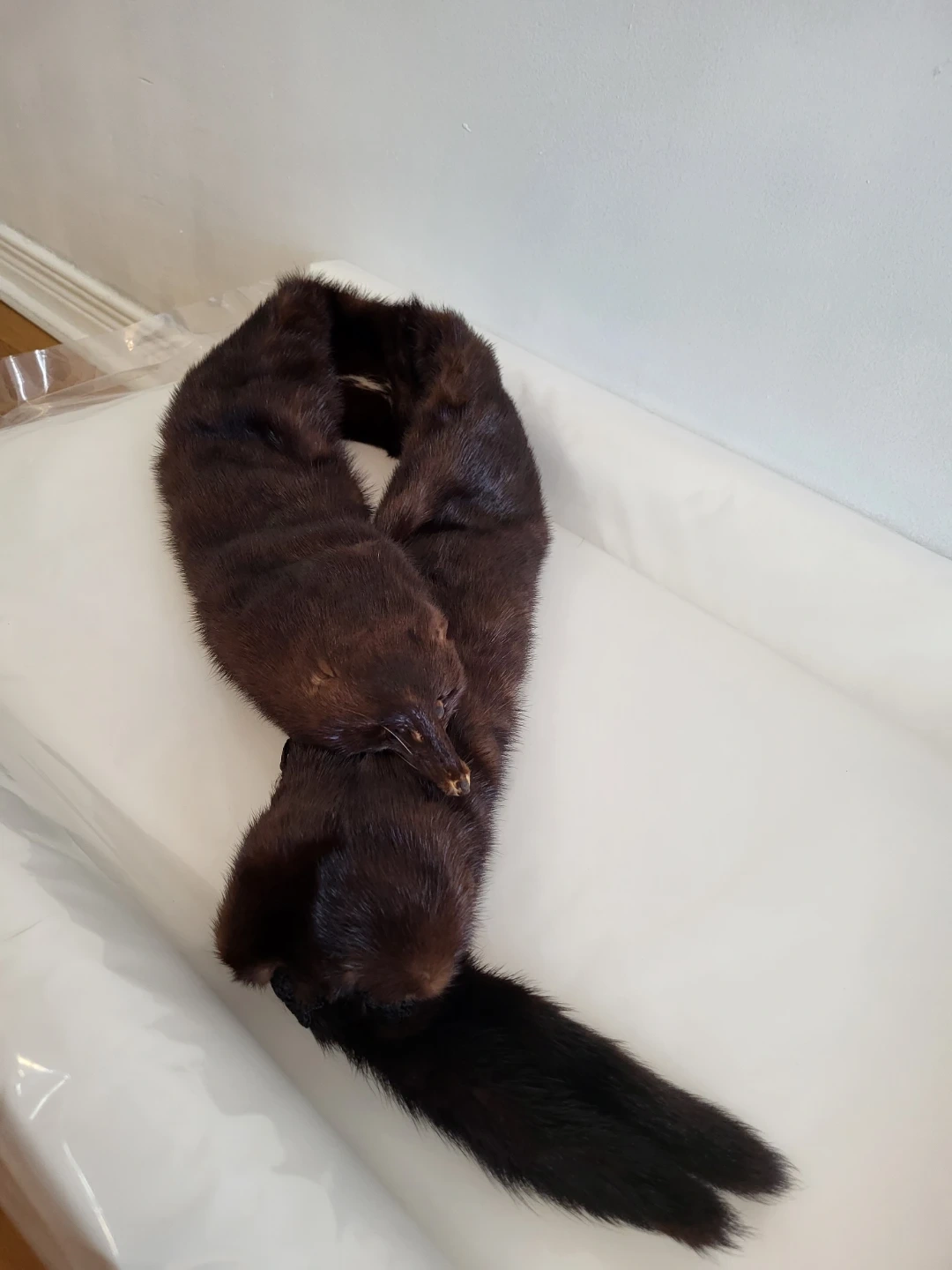 Buy & SellVintage Mink Fur Stole ScarfVintage Mink Fur Stole Scarf$60This is a vintage mink fur stole or scarf. It's dark brown in colour. It features a full animal head and tail.WHERE TO MEETyonge/finchView MapSELLERyoungjeiWillowdale E24928 reviews1 chats·2 favorites·76 viewsSEND CHAT TO SELLERHi youngjei! I’m interested in your listing.Hi youngjei! I’m interested in your listing.Get the Karrot app to chatSign In to chat