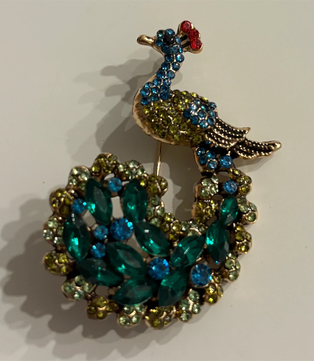 Gorgeous Peacock Brooch with Green and Blue Rhinestones