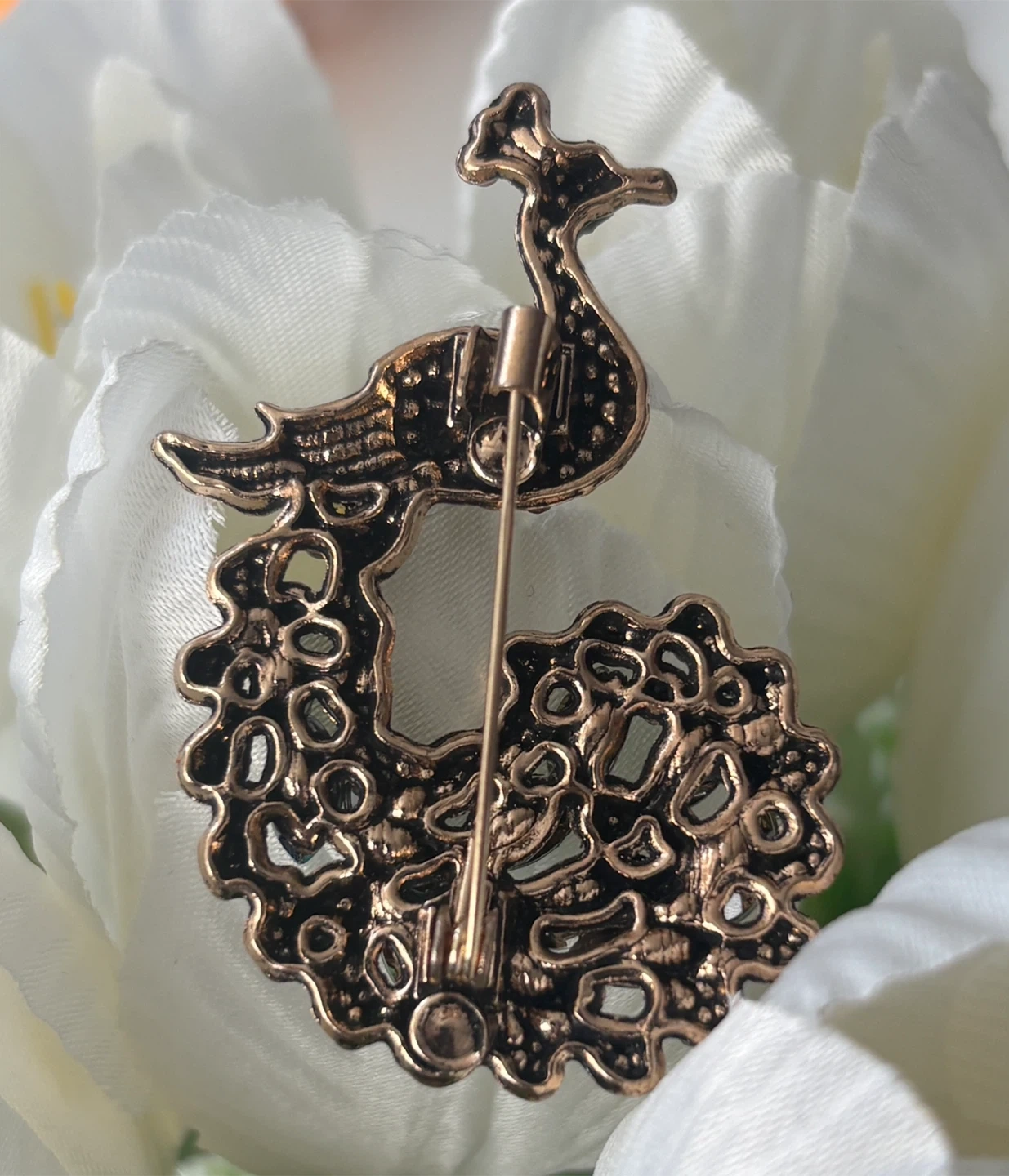 This decorative brooch is shaped like a peacock with a wreath accent. It features a mix of green and blue rhinestones for a dazzling effect. The metal backing has a secure pin closure.