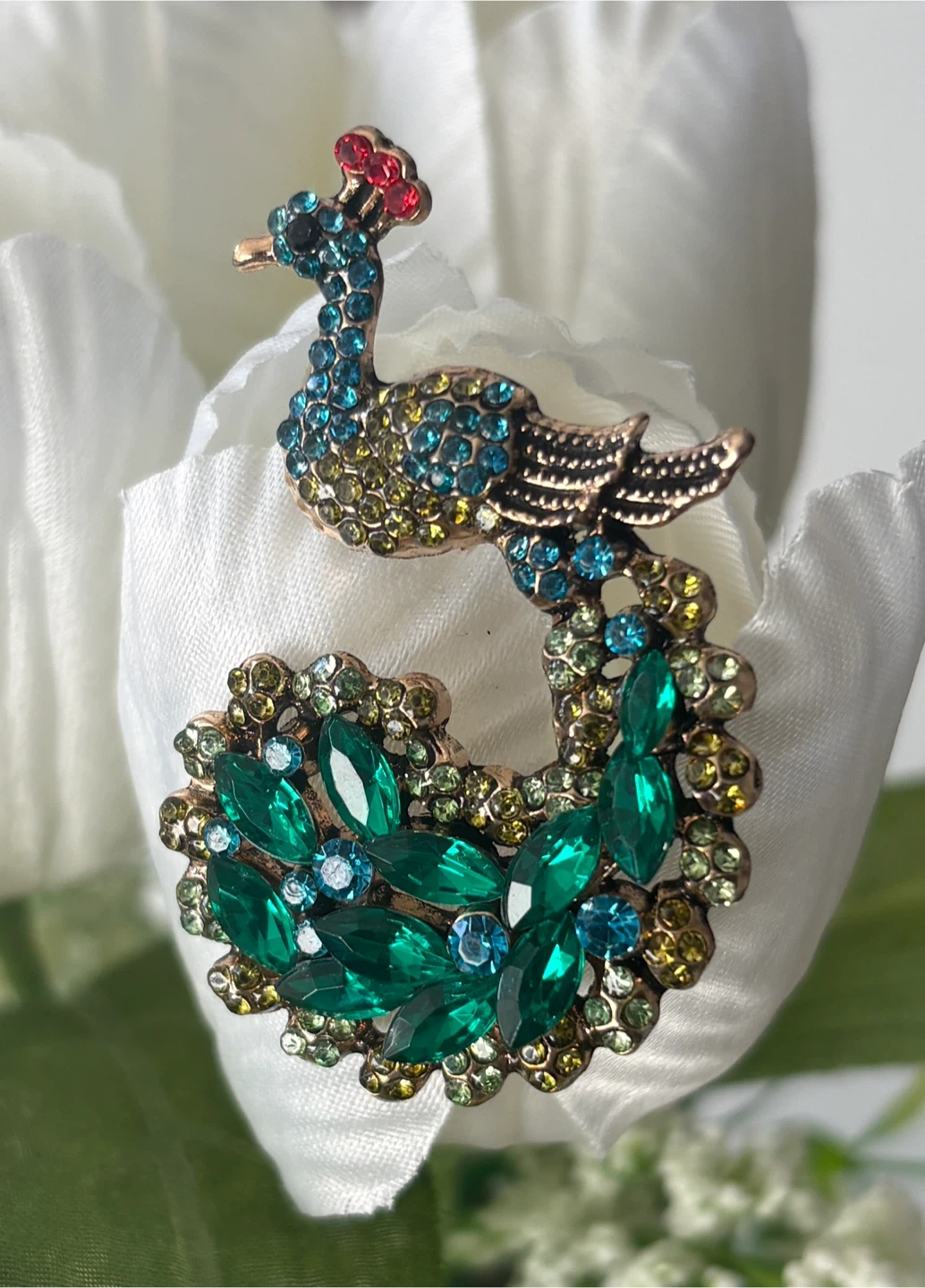 Gorgeous Peacock Brooch with Green and Blue Rhinestones