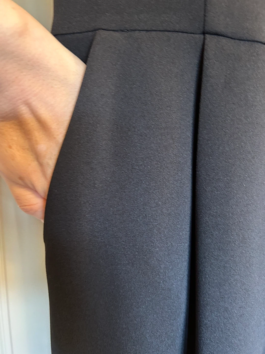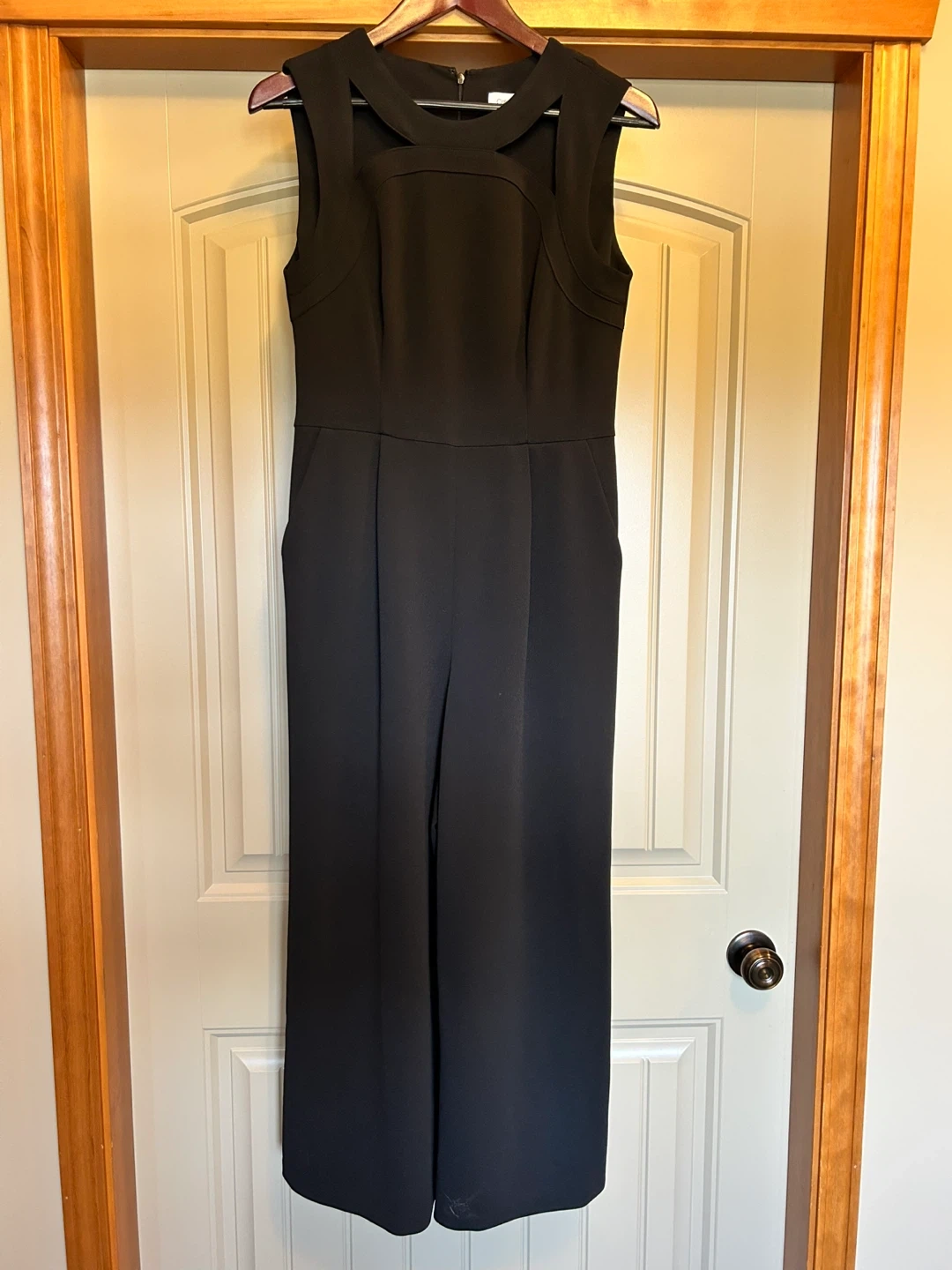 This Calvin Klein jumpsuit is black and sleeveless. It's a size 8 with wide legs. Perfect for a night out, business, or a formal event!