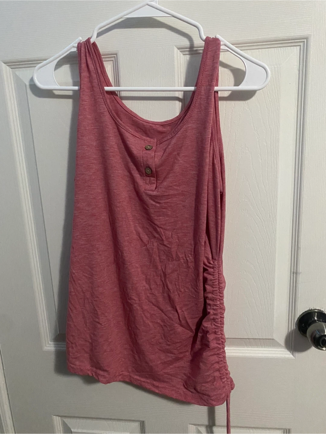 A cute pink tank top with a ruched side detail and button accents. It's made of a soft, stretchy material. This top is great for casual wear or layering!