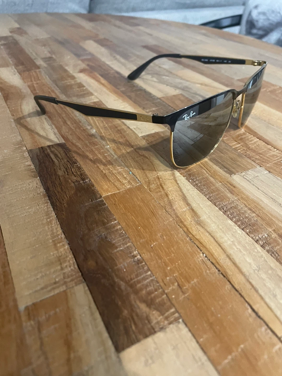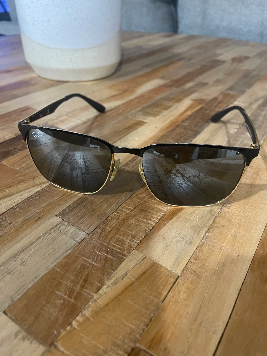 Classic Ray-Ban sunglasses with a black and gold frame. They come with their original case and lens cloth. These shades offer timeless style and good protection. Lenses are scratched