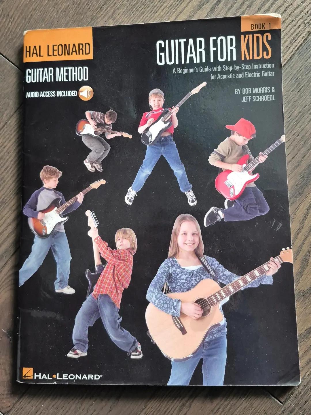 This is Book 1 of the Hal Leonard Guitar Method for Kids. It's a beginner's guide for acoustic and electric guitar, featuring step-by-step instruction. Audio access is included with this book.