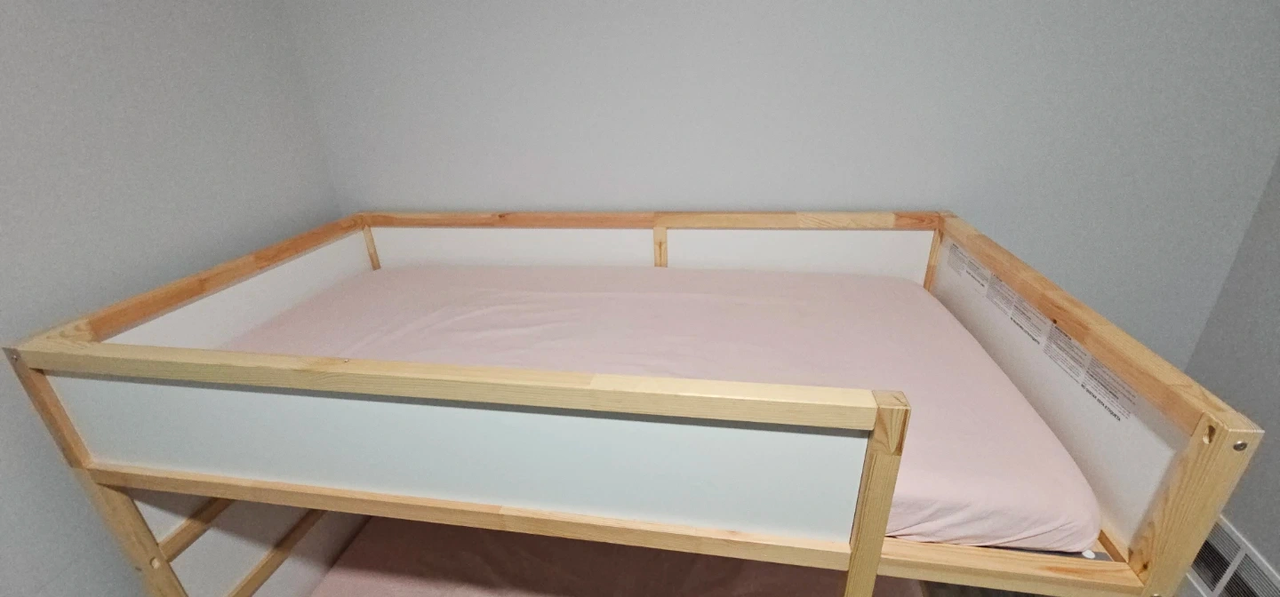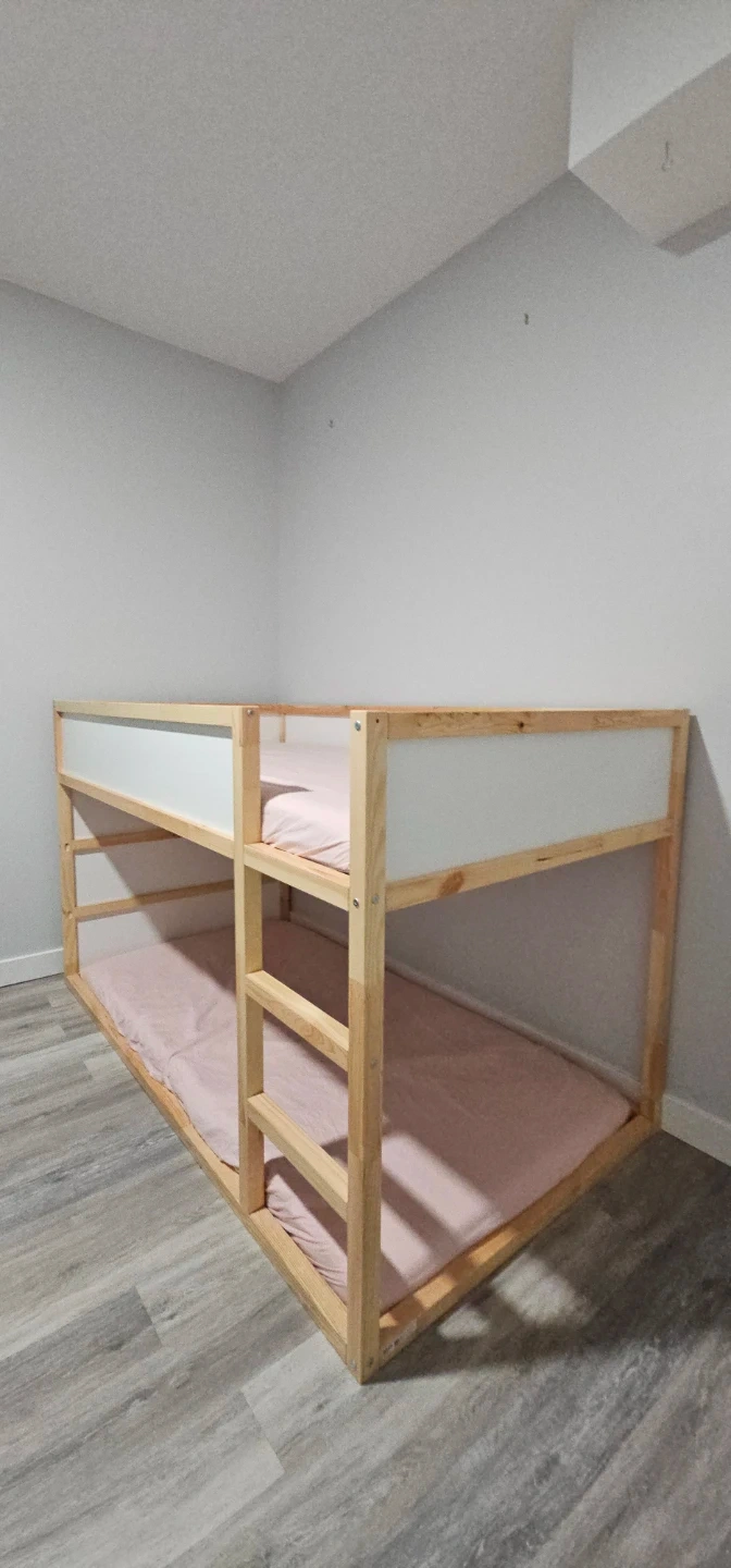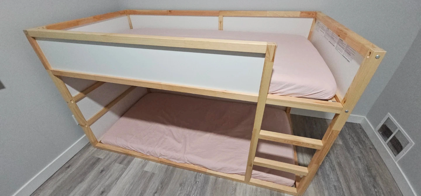 This is a wooden bunk bed frame. It features white panels for a clean look. This bed is perfect for saving space in smaller rooms or for siblings sharing a room. Comes with two mattresses.