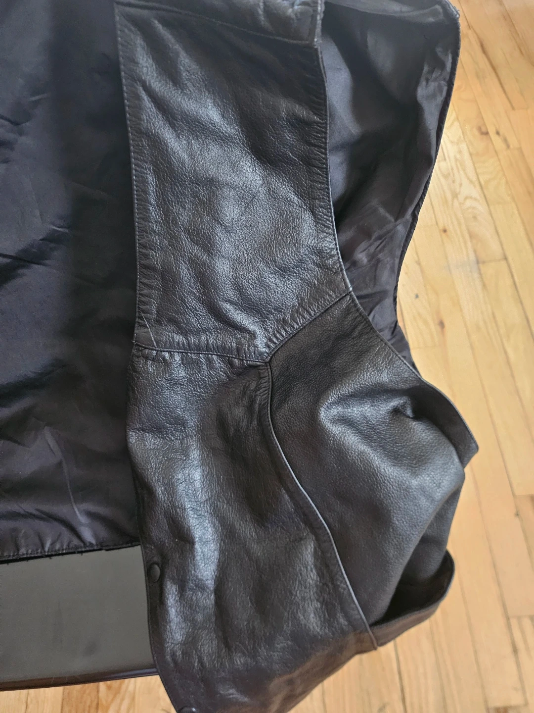 Leather King black leather Biker vest size 74 Features a snap-button front closure and two front pockets. Unlined like new 631 680-6779