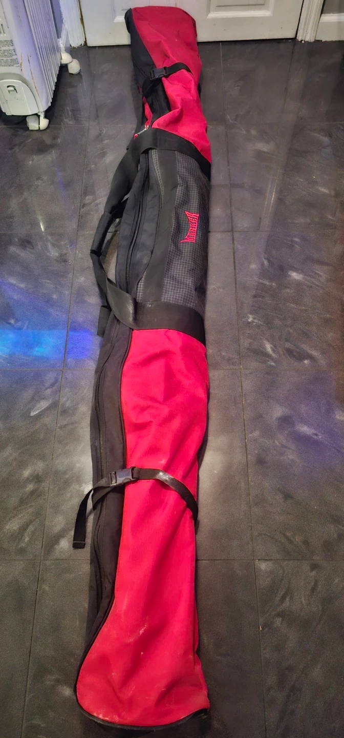 This is a set of Olin skis, red and black, with Salomon ski poles. Skis include bindings. Great for hitting the slopes!