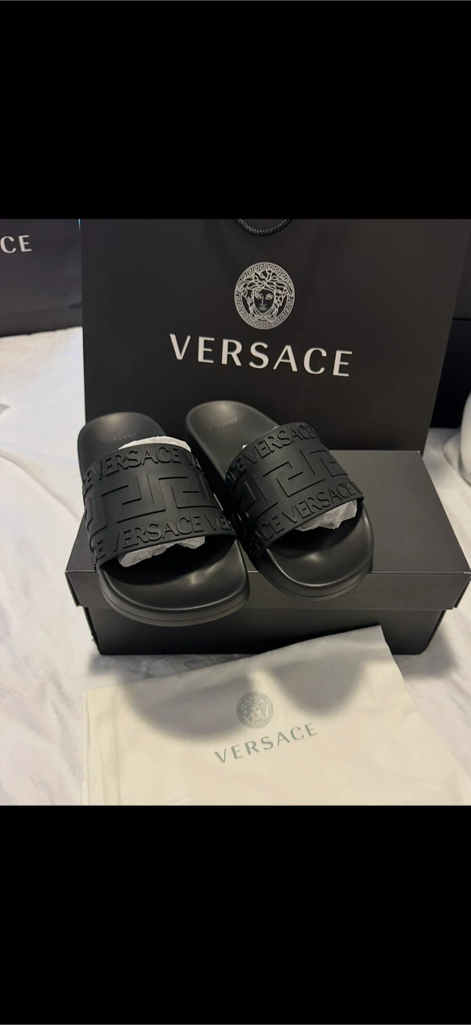 Versace black Greca pool slides, size 6, brand new and unworn, complete with original box, stuffing, and dust bag. These slides feature the iconic Greca pattern across the strap, blending luxury, comfort, and high-fashion style.