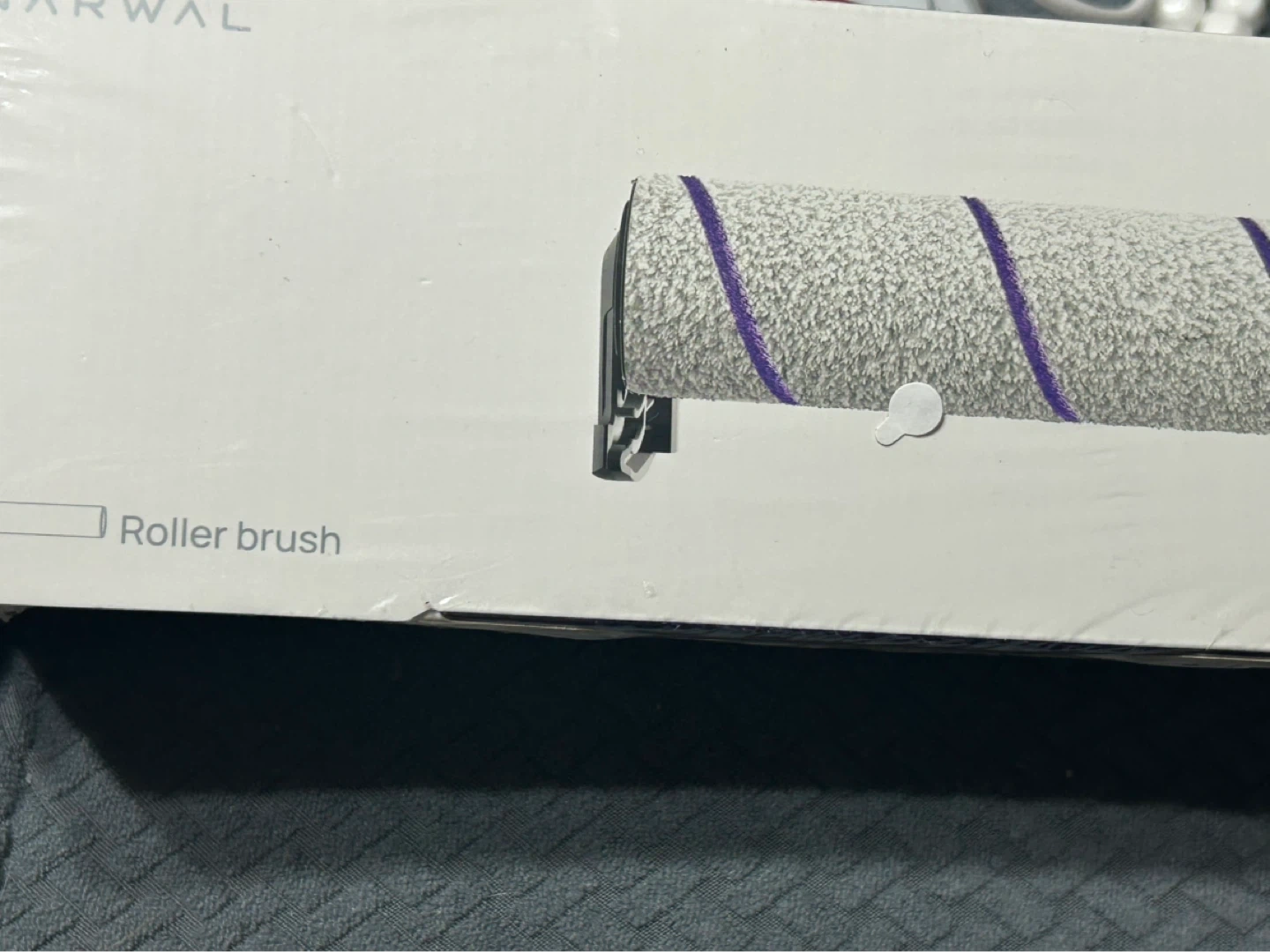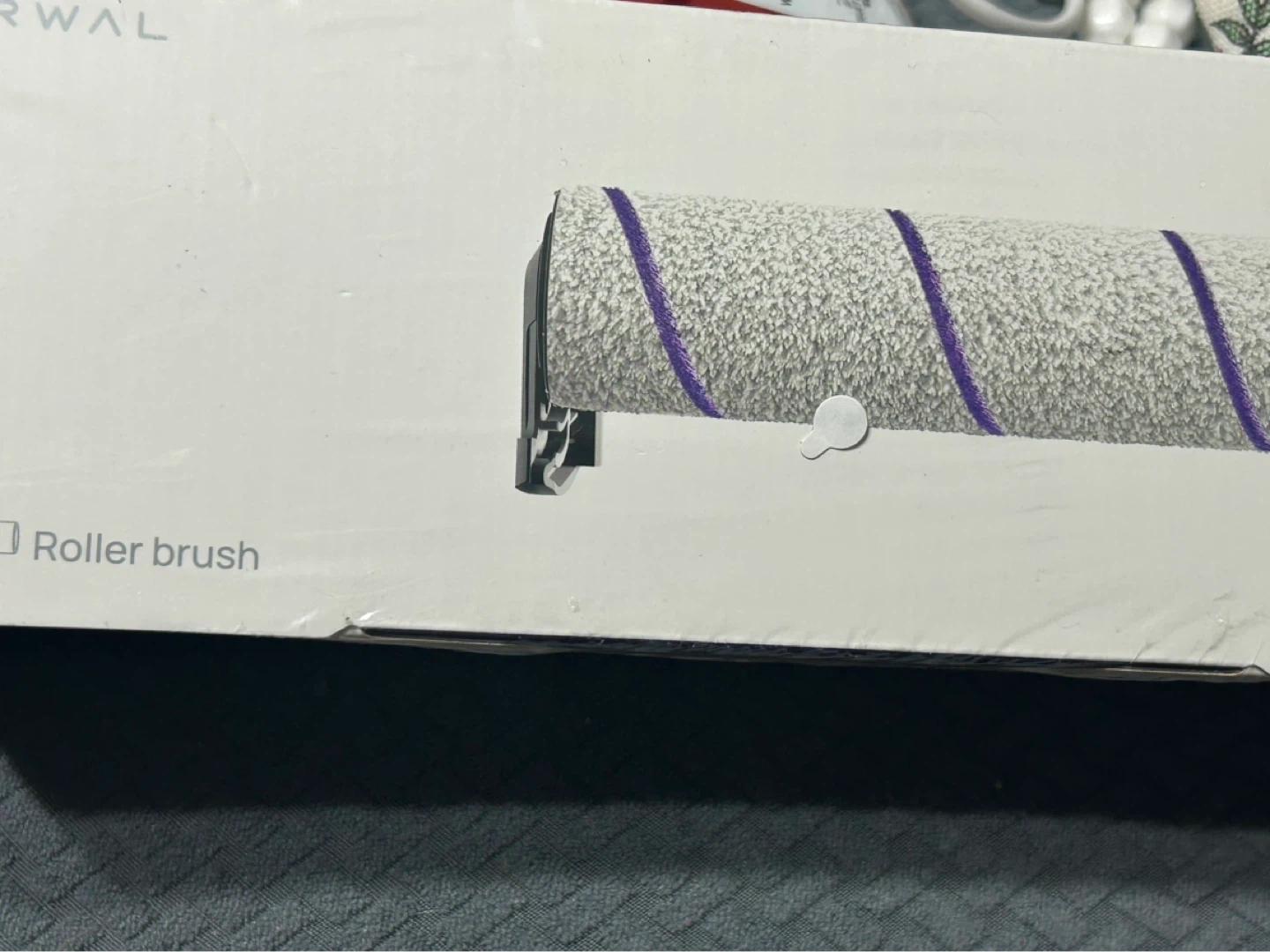 This is a new replacement roller brush for Narwal vacuum cleaners. It has a textured grey material with purple stripes. It's designed for effective floor cleaning.still in original package.