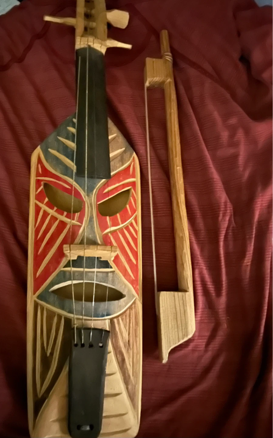 This is a unique, handmade wooden fiddle or violin with a decorative mask design. It comes with a wooden bow. The instrument is crafted from wood and features painted details in red and blue. It would make an interesting decorative piece or a unique musical instrument.