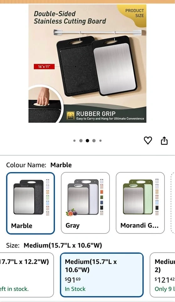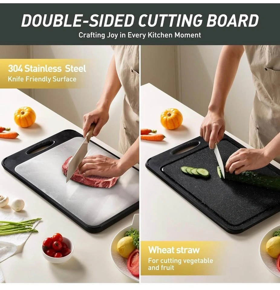Dual-sided cutting for versatile use: features a stainless steel side for slicing meats and a wheat straw PP side for fruits and vegetables. Built-in juice groove & grinder: The wheat straw PP side features a juice groove that efficiently collects liquids, keeping countertops clean and organized. The chopping board also includes an integrated garlic grinding zone, allowing you to grind garlic or ginger directly on the board. Durable & food-safe materials: features 304 stainless steel on one side and food-grade wheat straw PP on the other, ensuring durability and safety. This dual-sided cutting board is BPA-free, making it safe for direct food contact.