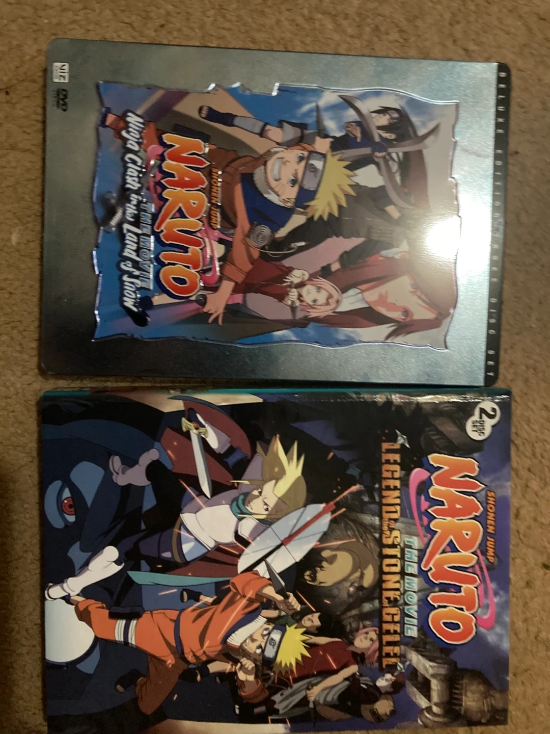 This is a VIZ DVD set featuring two Naruto movies: 'Ninja Clash in the Land of Snow' and 'Legend of the Stone Gelel'. It's a 2-disc set.