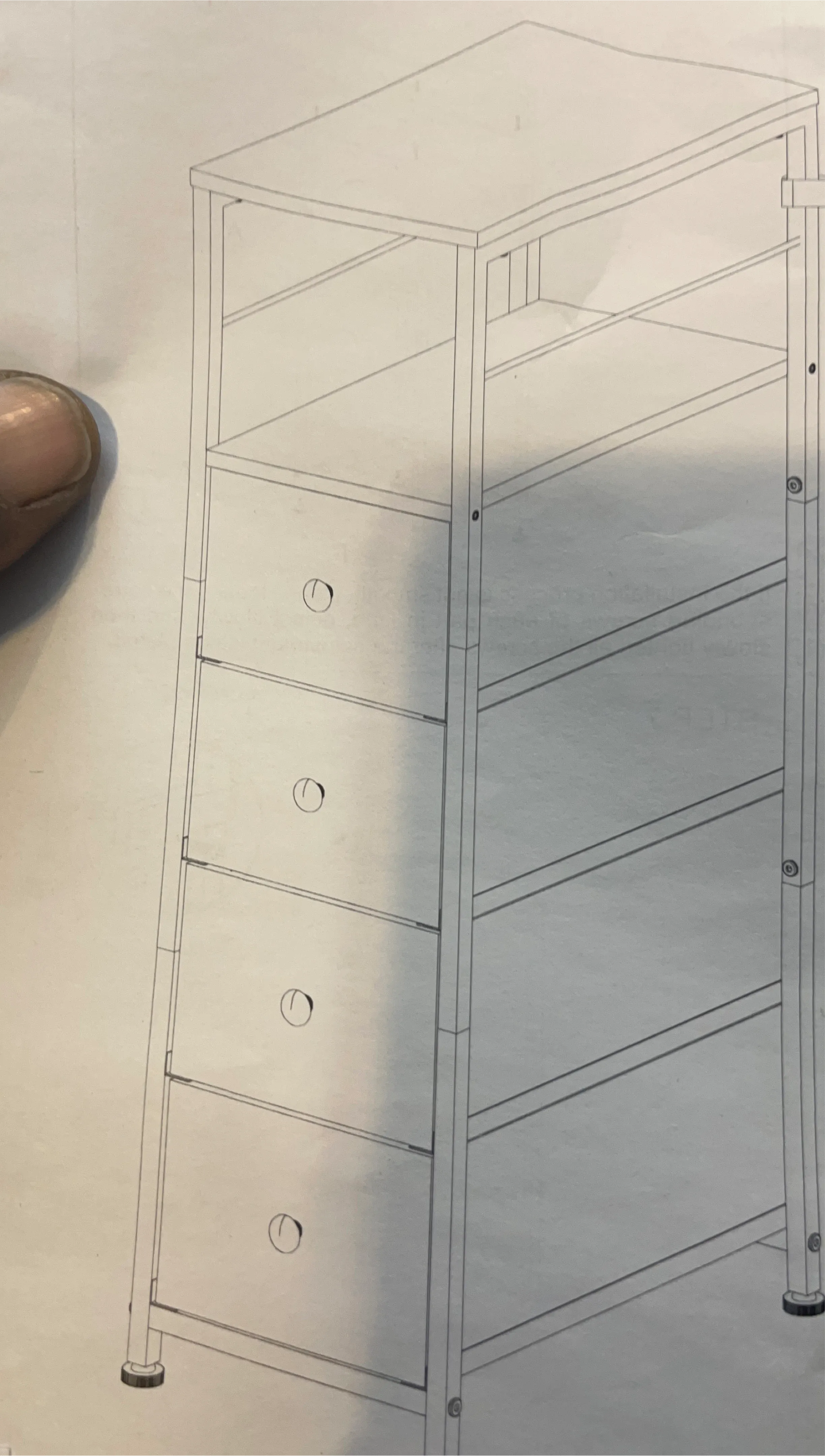 This storage tower features five drawers for organizing your items. It has a metal frame and fabric drawers. Comes with adjustable feet for stability. This organizer is not assembled. It’s still in the box.