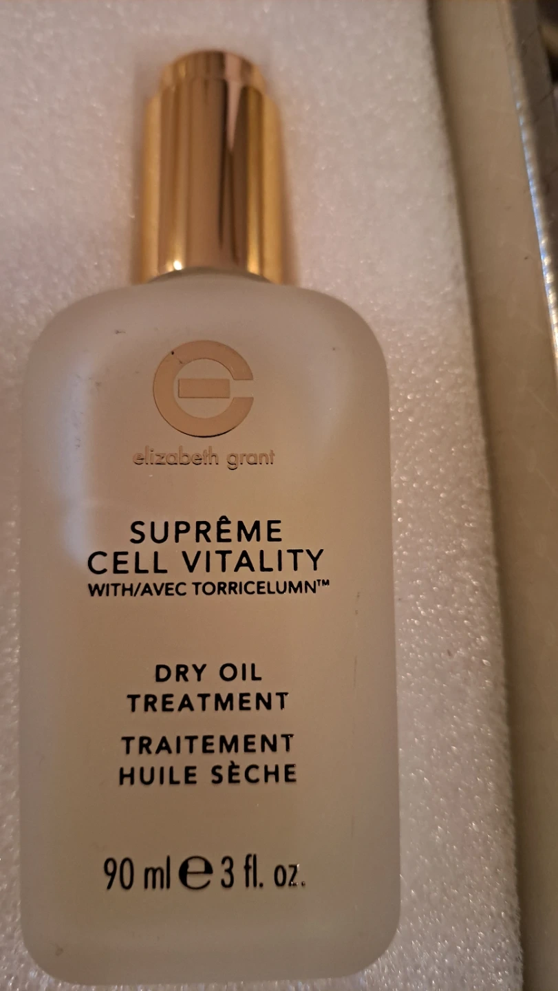 This is Elizabeth Grant Supreme Cell Vitality Dry Oil Treatment. It's a 90 ml bottle, also listed as 3 fl. oz. This dry oil treatment is designed for skin vitality.