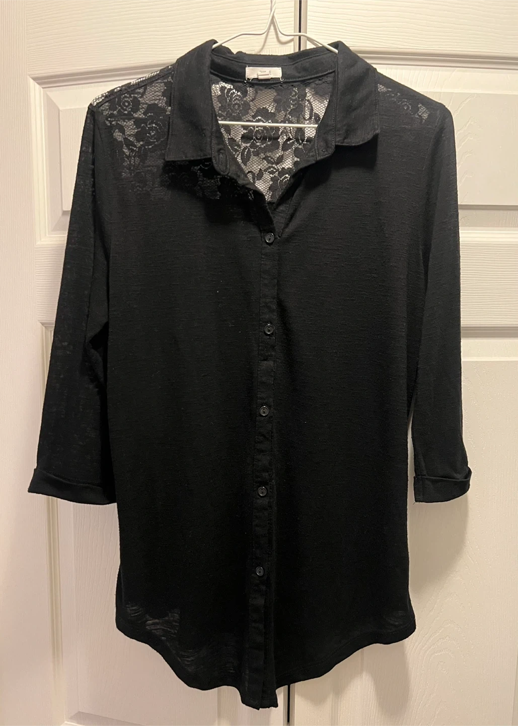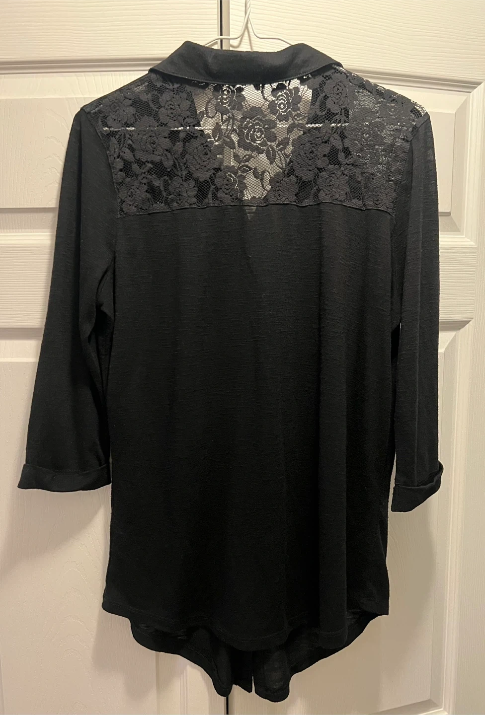 This black button-up shirt features a beautiful lace panel on the back. It's a lightweight, casual top with a collared neckline and three-quarter sleeves. The lace detail adds a touch of elegance to this everyday piece.