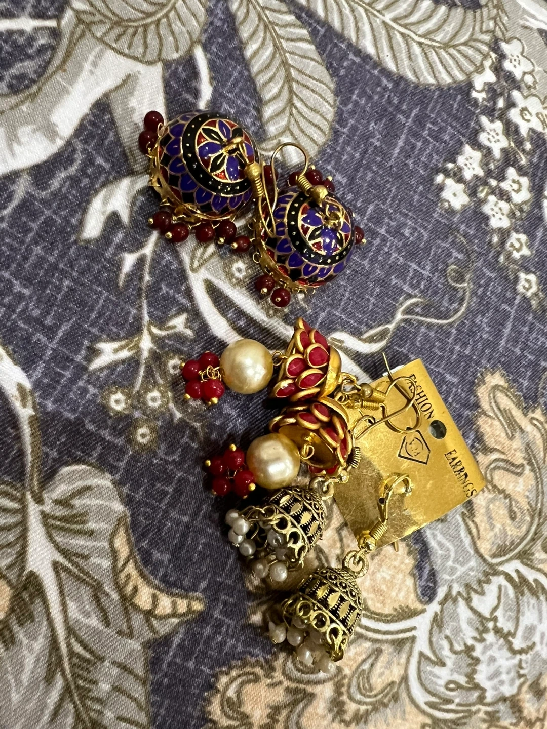 Gorgeous jhumka style earrings with pearl and bead accents. Intricate design with gold-tone metal. Perfect for adding a festive touch to any outfit!