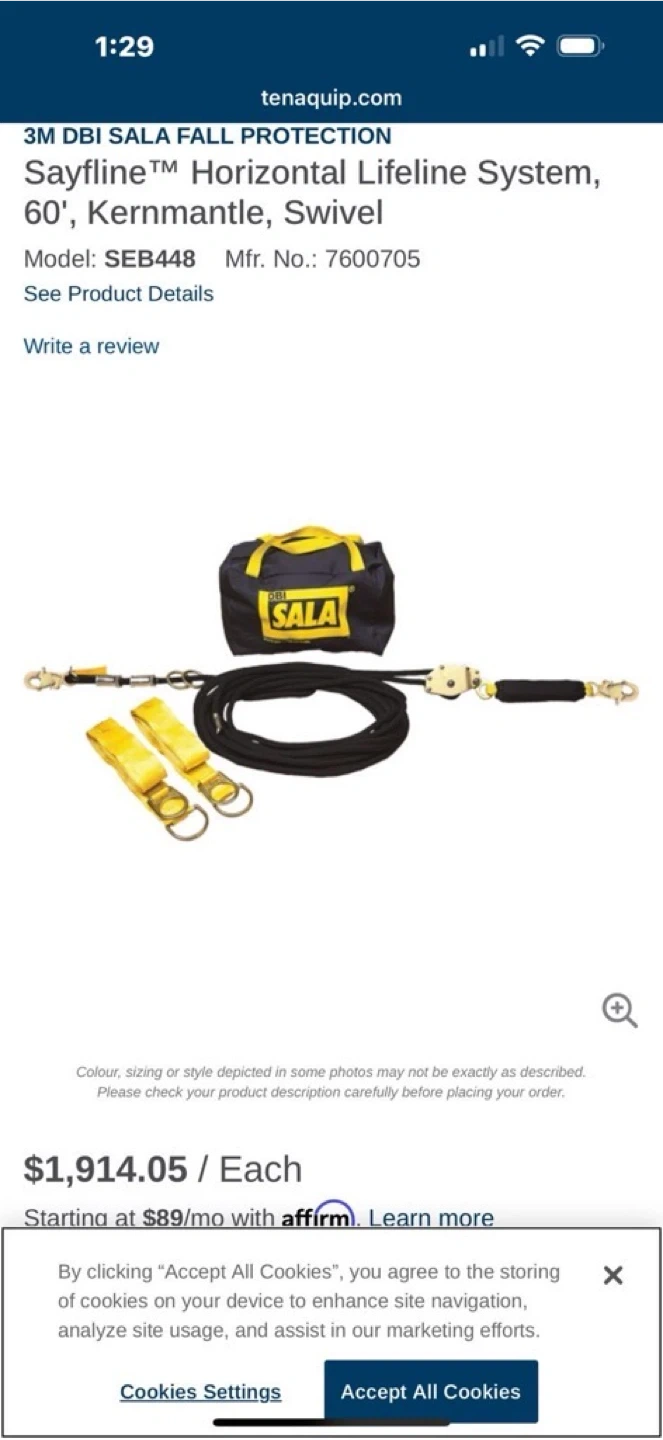 60Selling a 3M DBI SALA Fall Protection Sayfline Horizontal Lifeline System, 60', Kernmantle, Swivel, Model SEB448. Originally bought for $1,914.05.