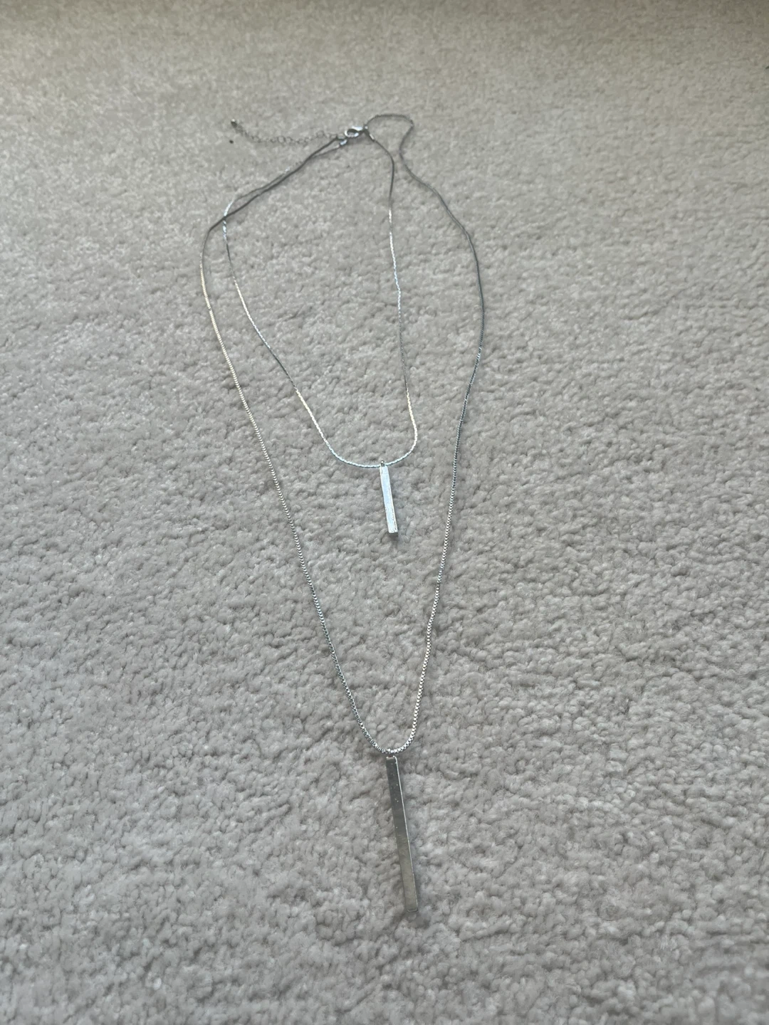 This layered necklace features two delicate silver chains with bar pendants. It's a simple and elegant accessory. The longer chain has a larger bar, and the shorter chain has a smaller bar.