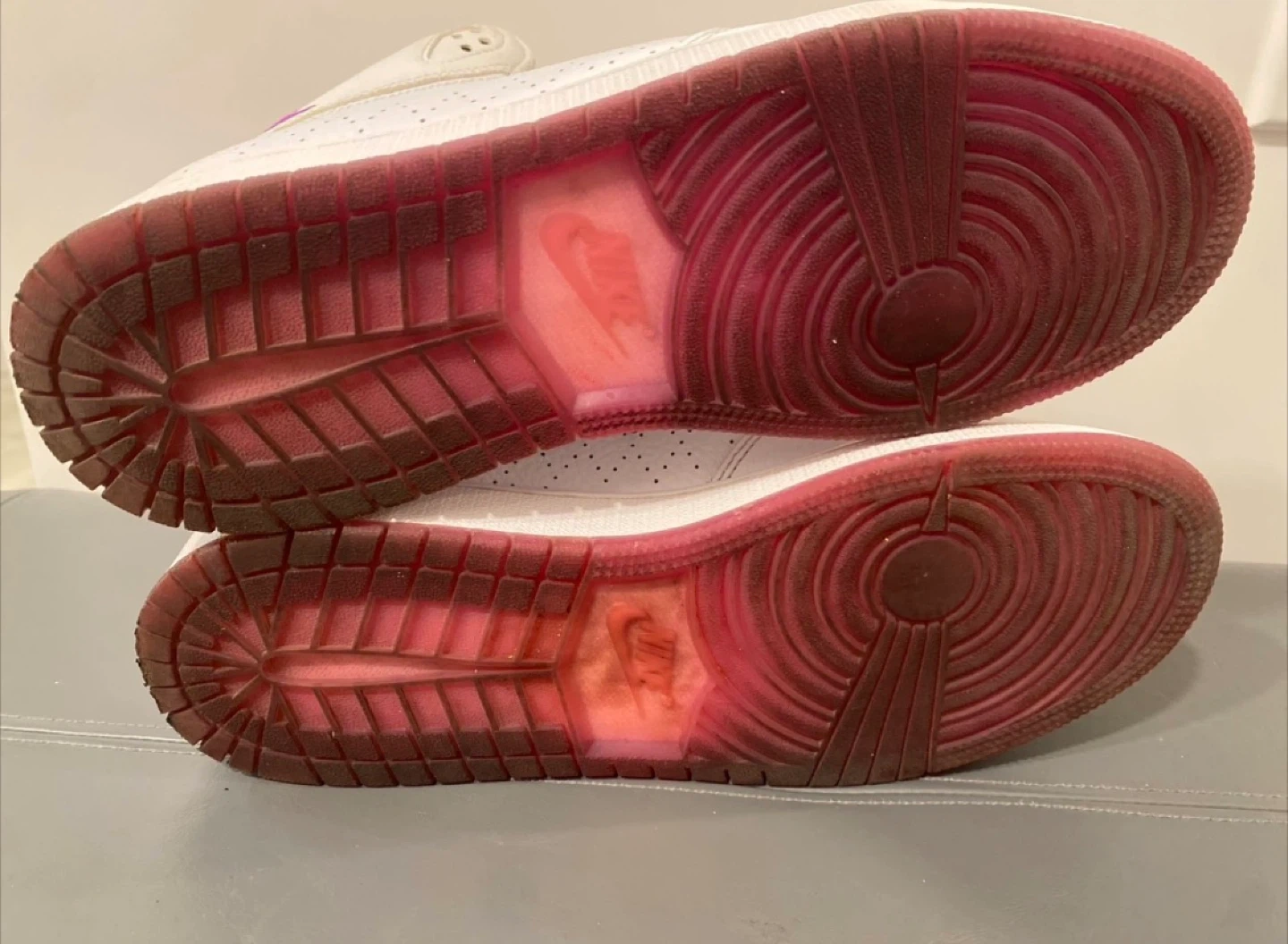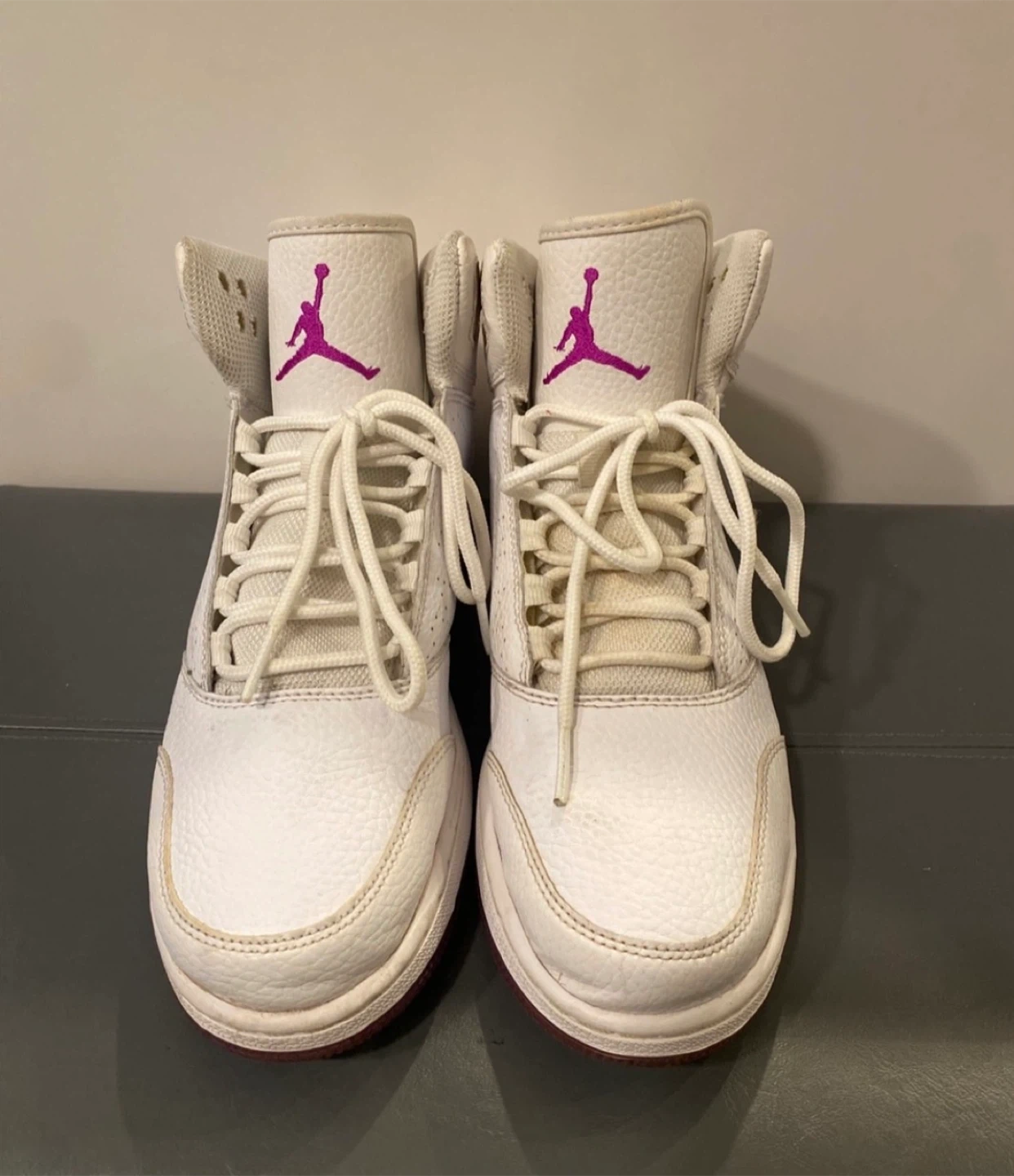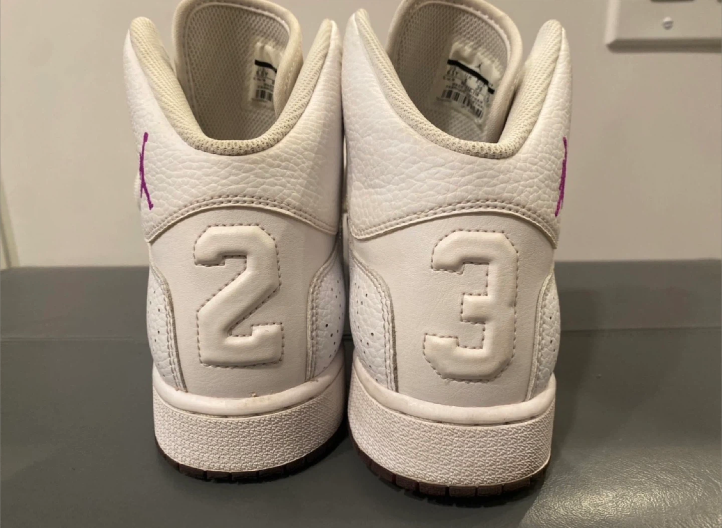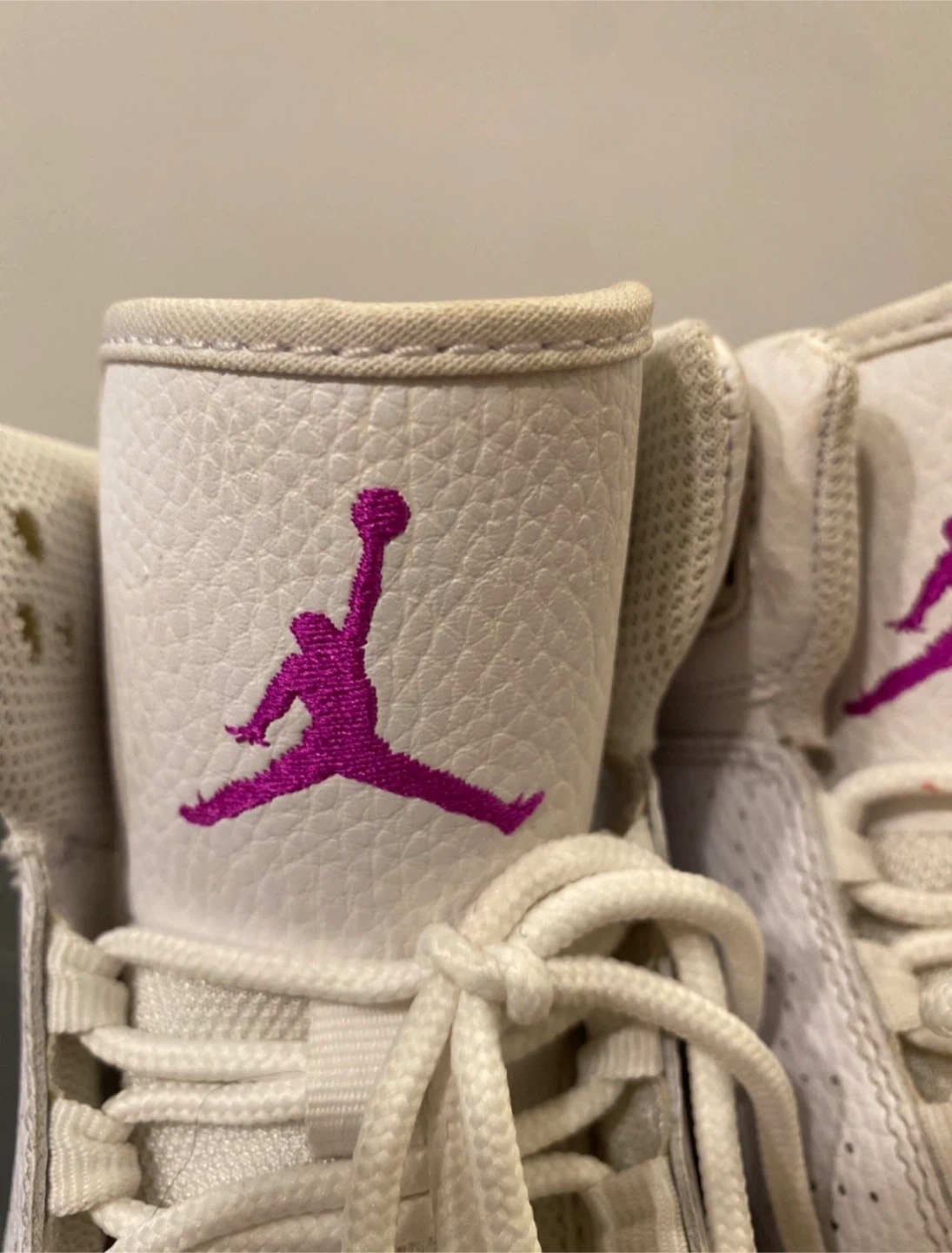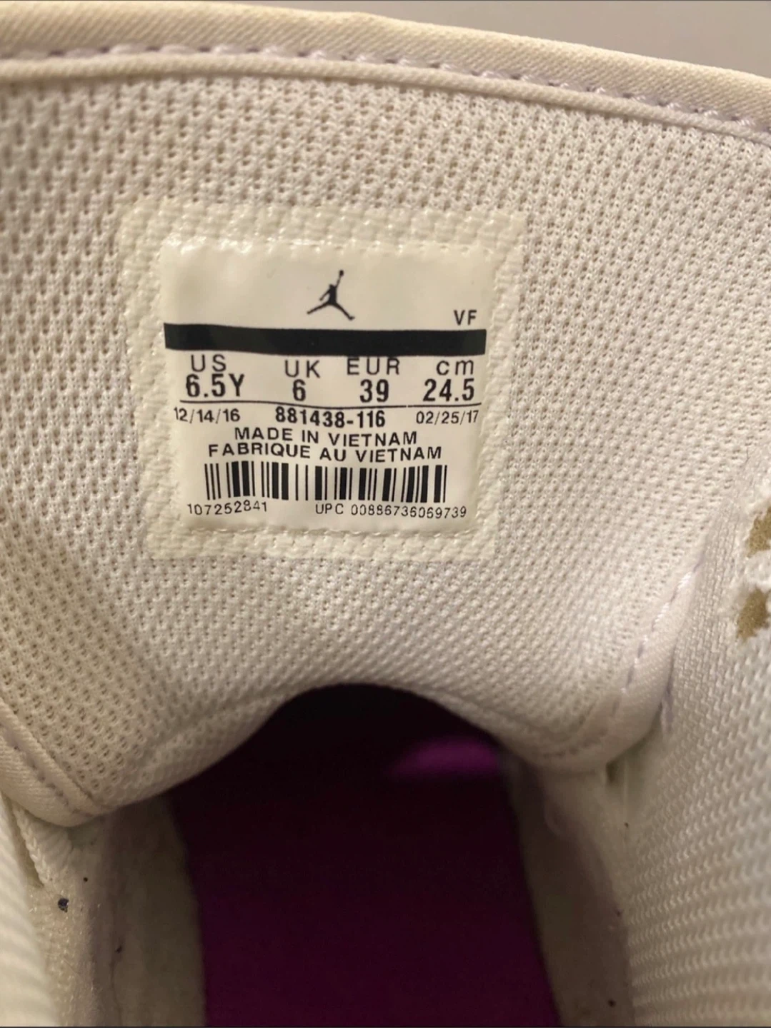 These are Jordan Air 1 High OG sneakers in white with purple accents. Size 6.5 Youth (US). Made in Vietnam. Excellent for everyday wear or casual sports!