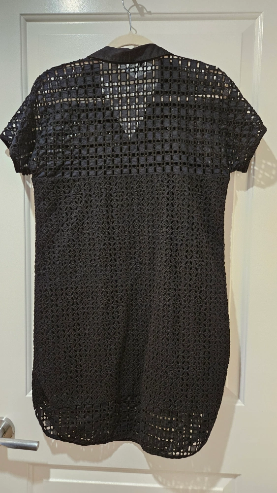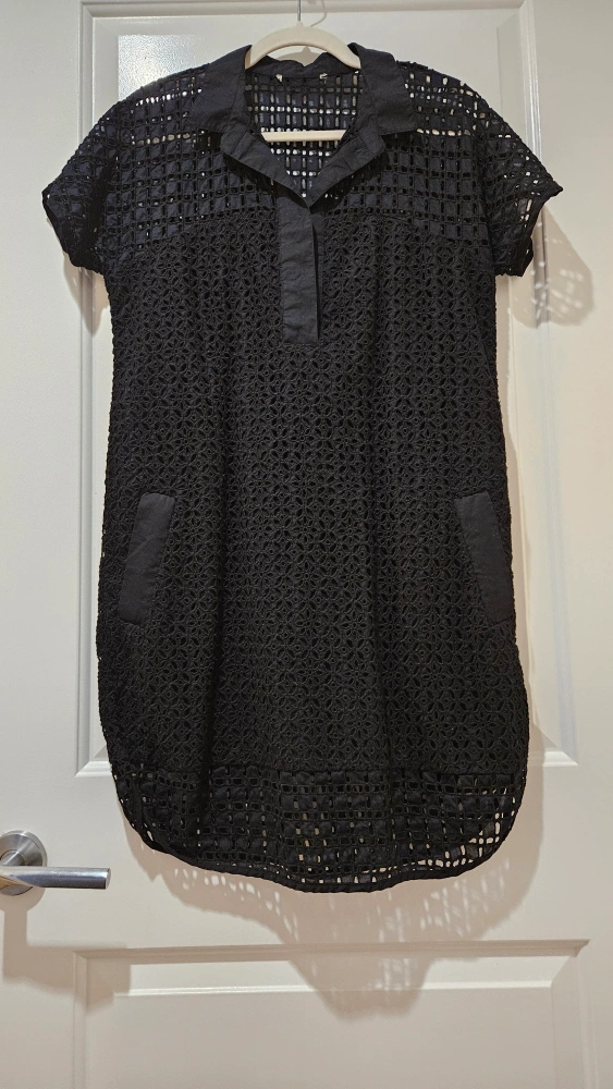 Black crochet dress with short sleeves, collared neckline, and pockets. Great in the winter with a pair of tights, or as is in the summer. Cotton material. Size Medium, but also fits a small.