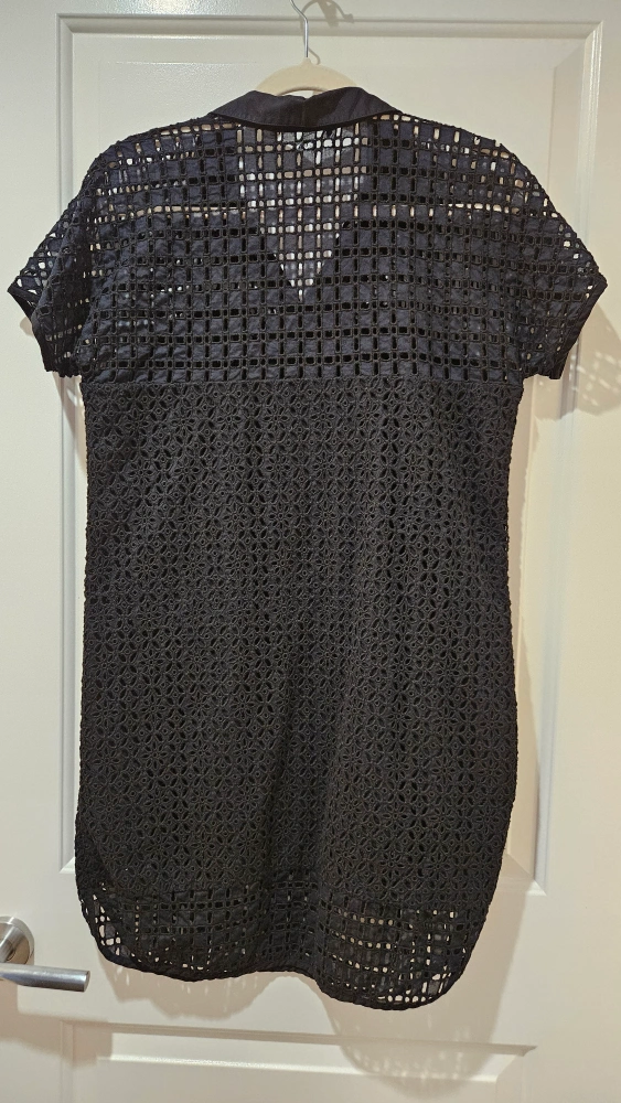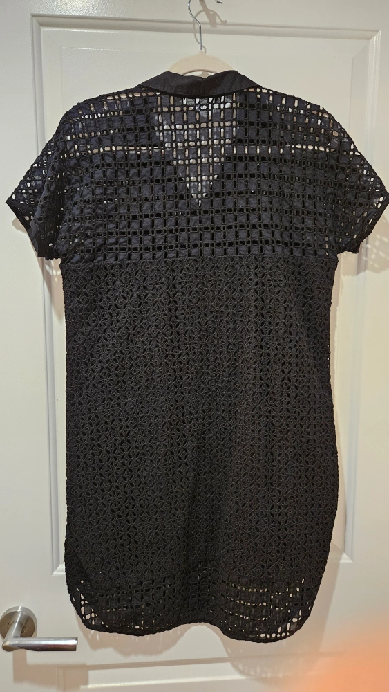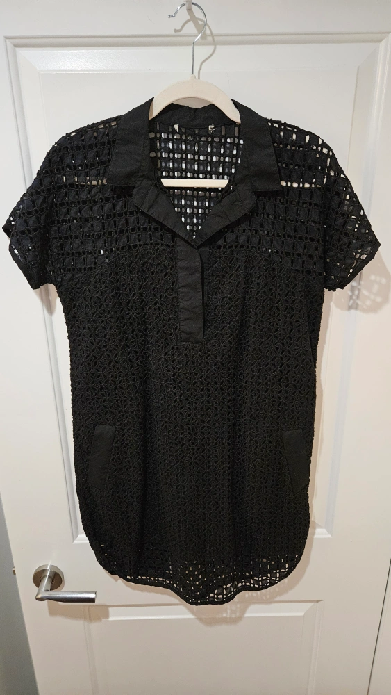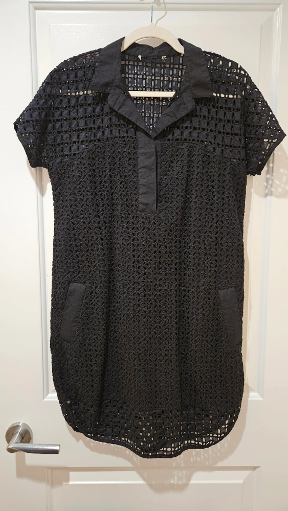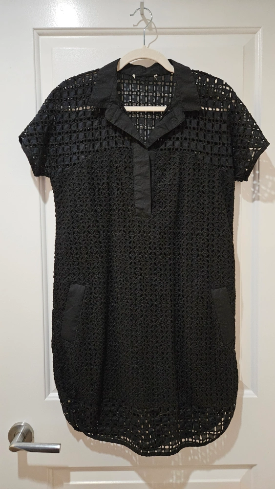 Black crochet dress with short sleeves, collared neckline, and pockets. Great in the winter with a pair of tights, or as is in the summer. Cotton material. Size Medium, but also fits a small.