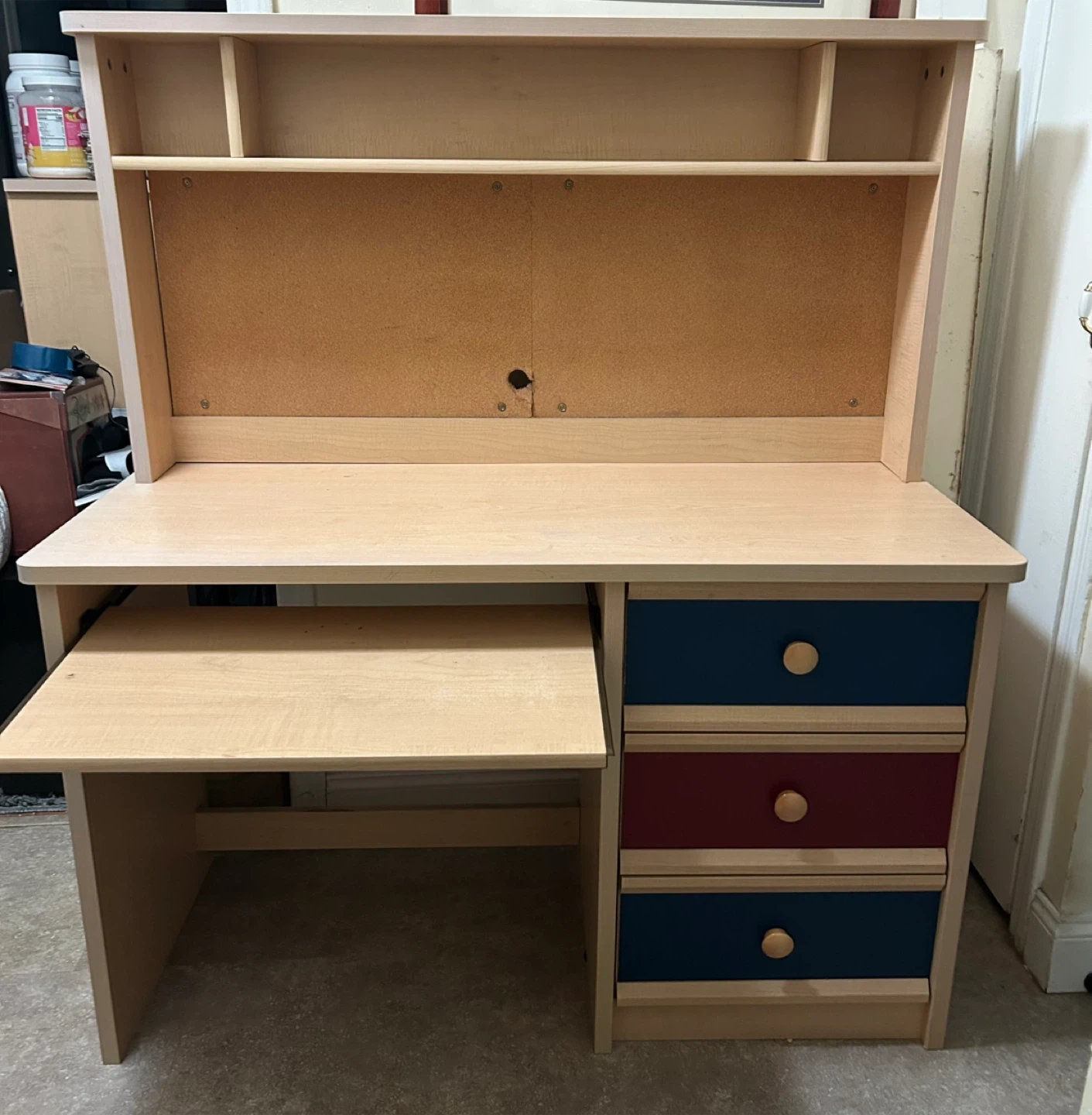 This light wood desk features a hutch with open shelving. It has a pull-out keyboard tray and three drawers with blue and red fronts. The drawer pulls are natural wood knobs.