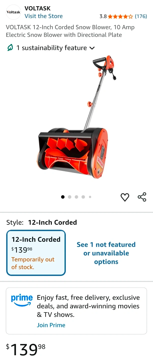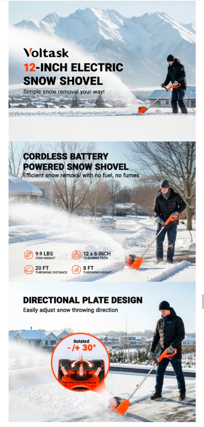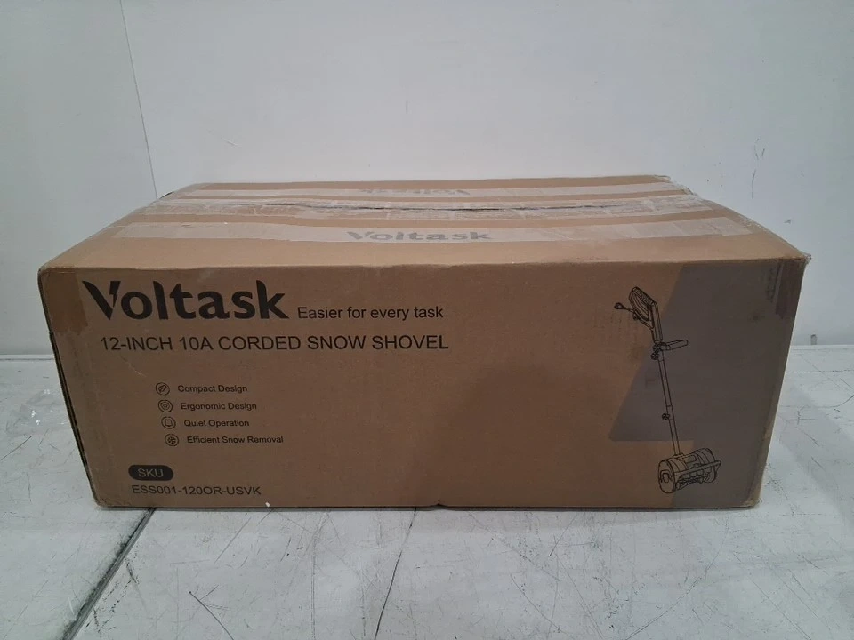 I'm selling a Voltask 12-Inch Corded Snow Blower in amazing condition. This electric snow shovel is lightweight and easy to handle, making snow removal a breeze. The snow blower is equipped with a powerful 10-amp motor and can throw snow up to 20 feet away. This snow blower can clear snow up to 12 inches wide and is optimal for a snow depth of 6 inches, making it ideal for driveways, steps, patios, decks, sidewalks and pathways.