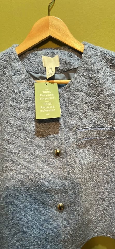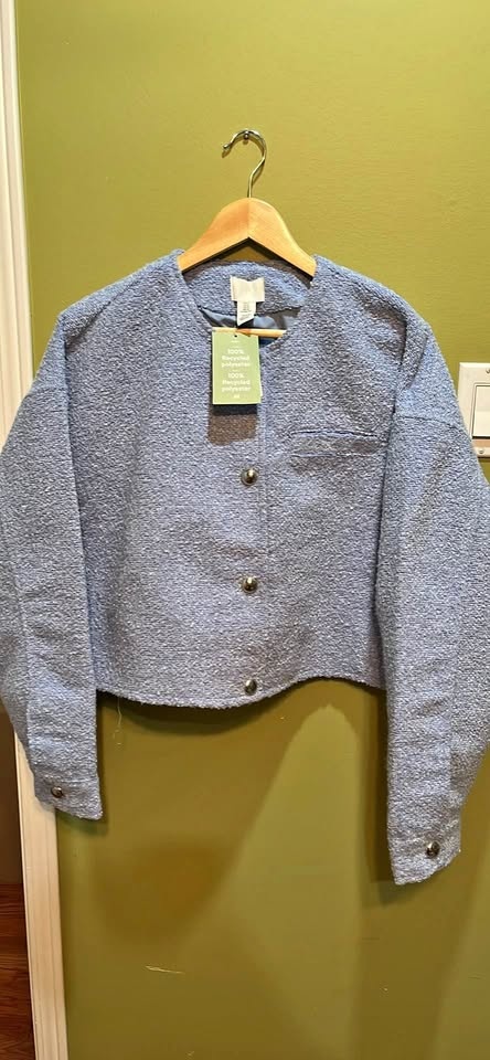 New H&M light blue textured cropped jacket. Has cool silver buttons down the front. Made with 100% recycled polyester. Size is XL.