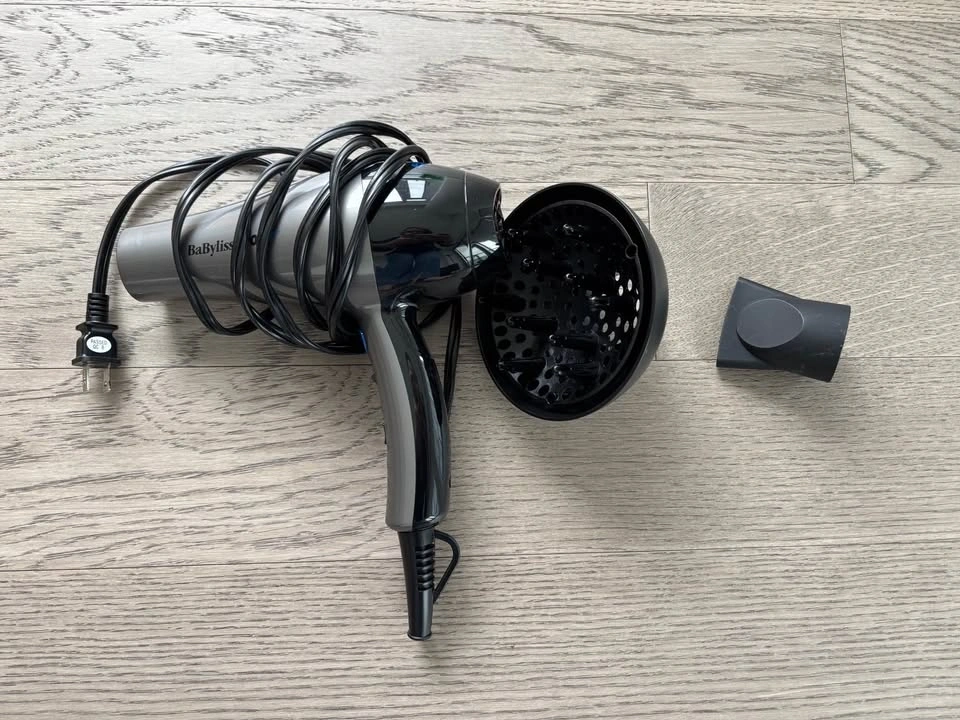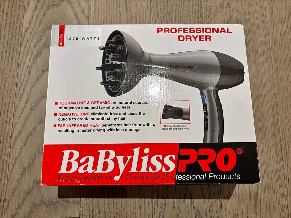Powerful BaBylissPRO professional hair dryer with 1875 watts, tourmaline and ceramic technology. Negative ions help reduce frizz, and far-infrared heat dries hair quickly with less damage. Includes both a diffuser and a concentrator nozzle. Pick up near Eglinton station in midtown.