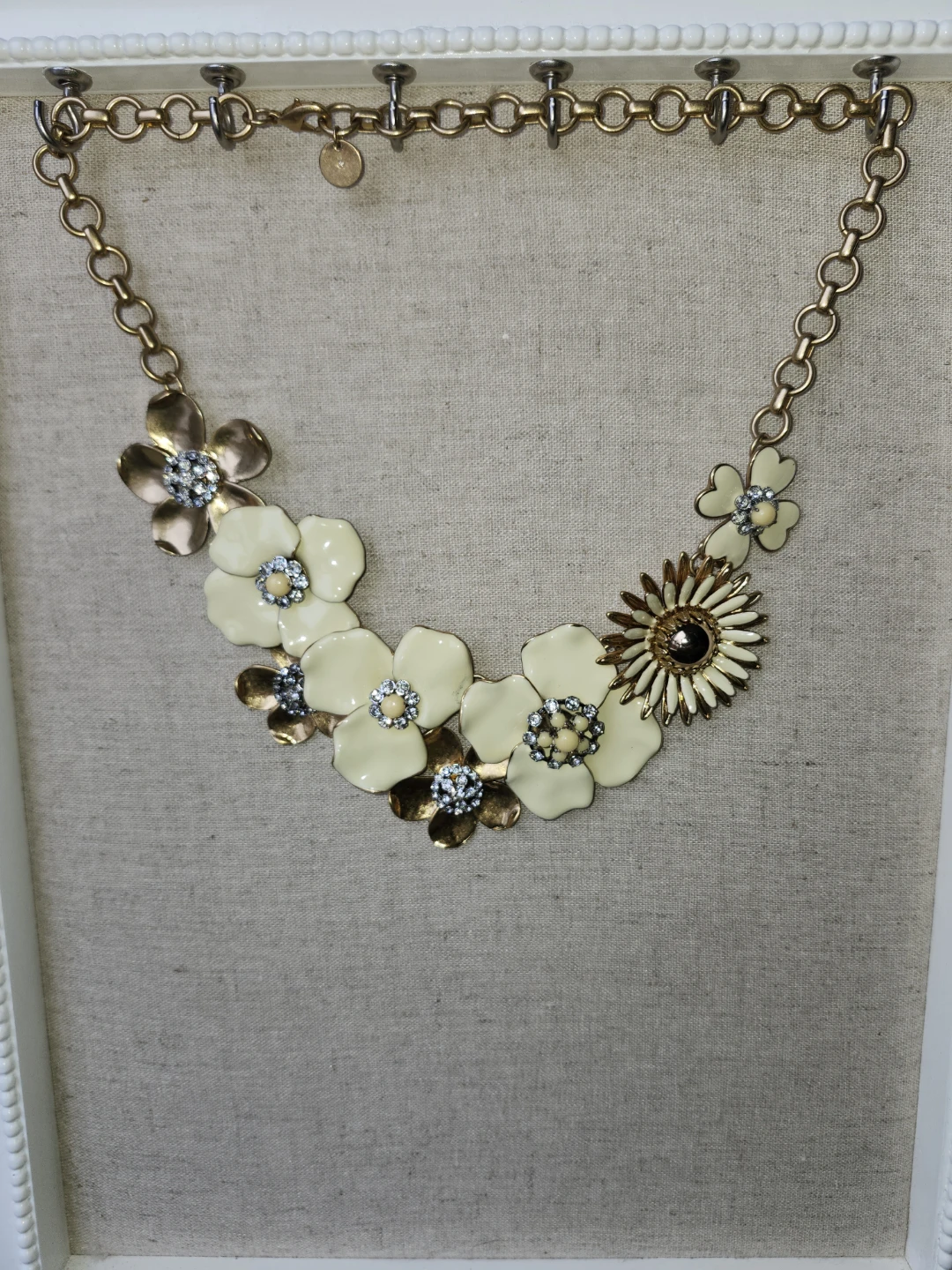 This is a Stella & Dot statement necklace featuring beautiful floral designs. The necklace has a gold chain and various flower accents in gold and cream colours. It's in great condition and would be a lovely addition to any outfit!