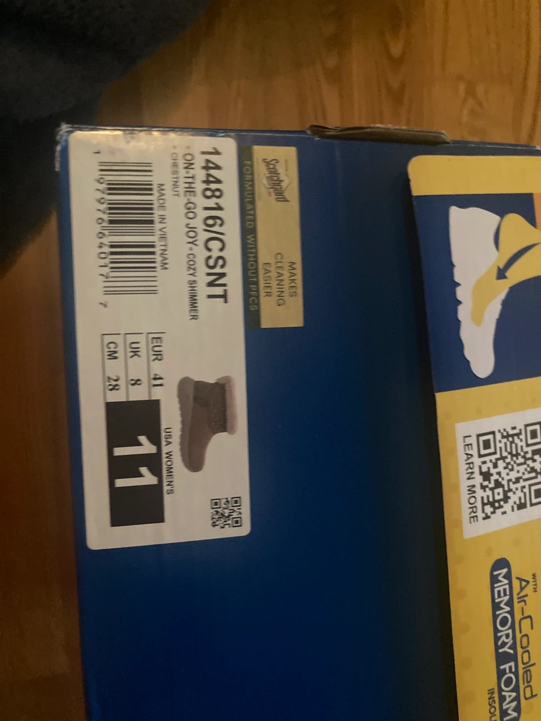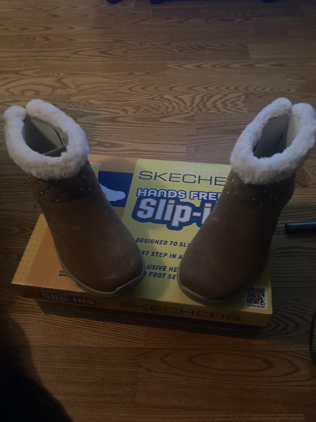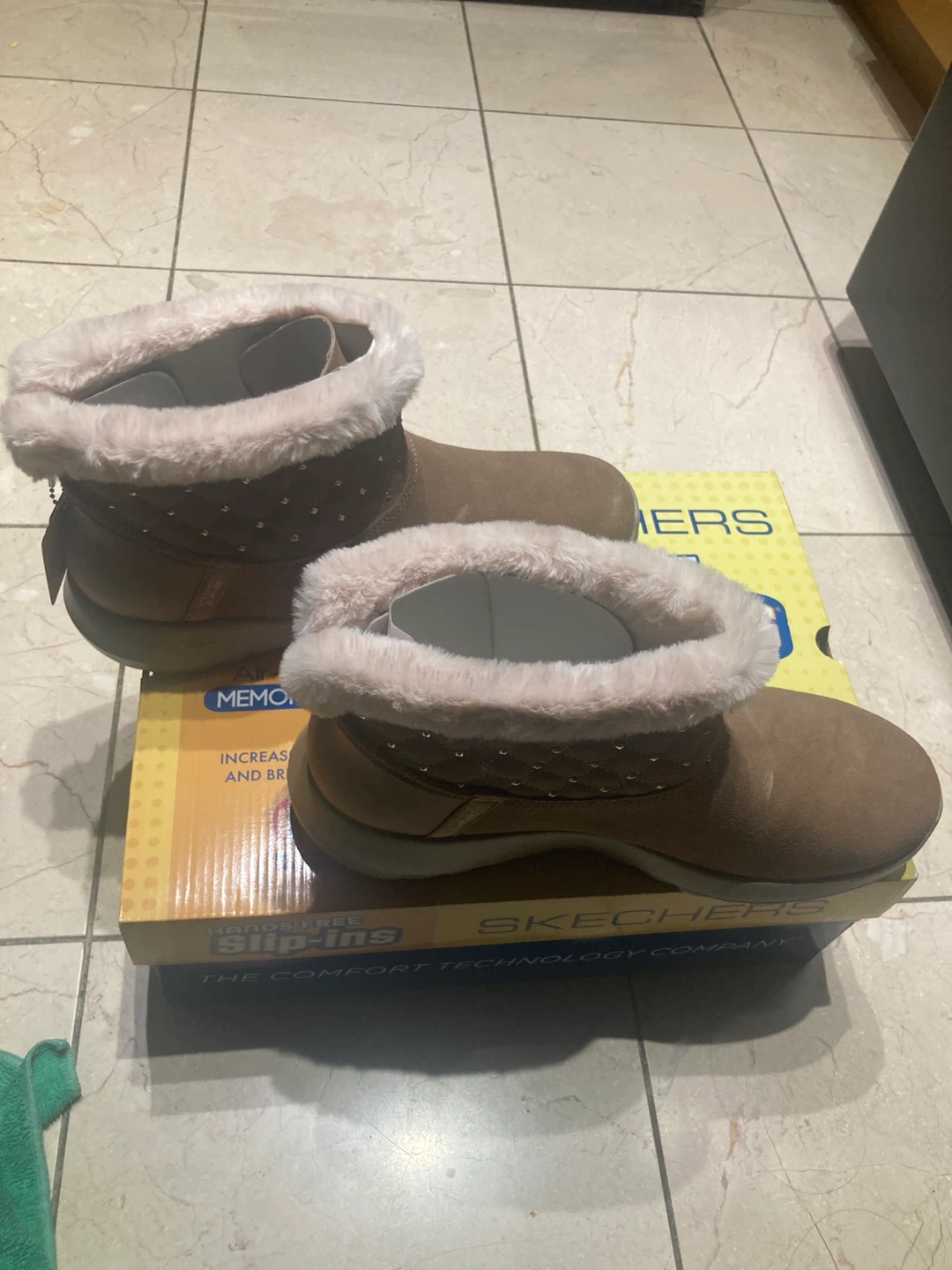 These are Skechers On-The-Go Joy Cozy boots in Chestnut colour. They're a women's size 11 and feature hands-free slip-ins with an air-cooled memory foam insole. Includes original box.
