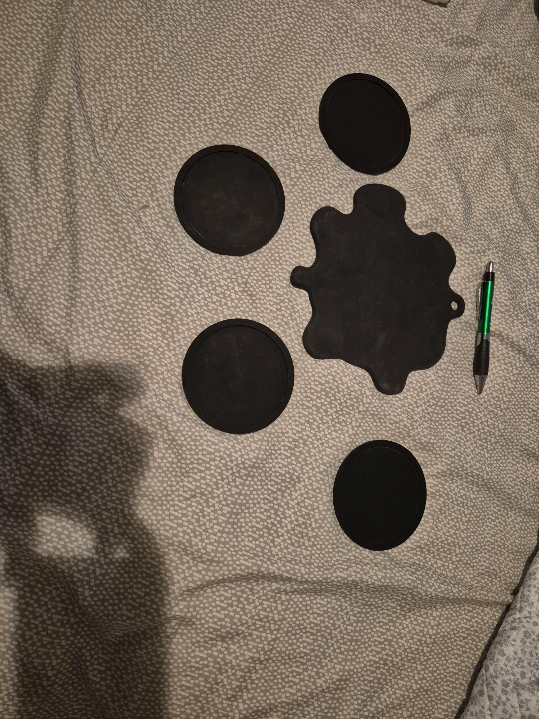 This set includes four round black coasters and one uniquely shaped black trivet. They're made of a flexible, non-slip material. Use these to protect your surfaces from spills and heat. Great for everyday use at home!