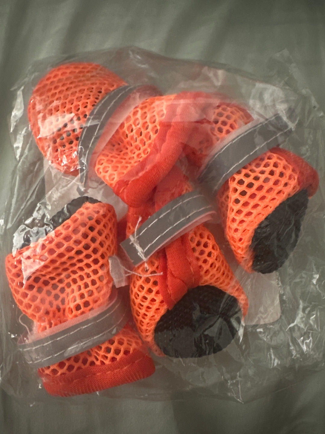 Brand new set of orange mesh dog boots! These are great for protecting your furry friend's paws from hot pavement or rough terrain. They feature a breathable mesh design and reflective straps for added safety during walks.