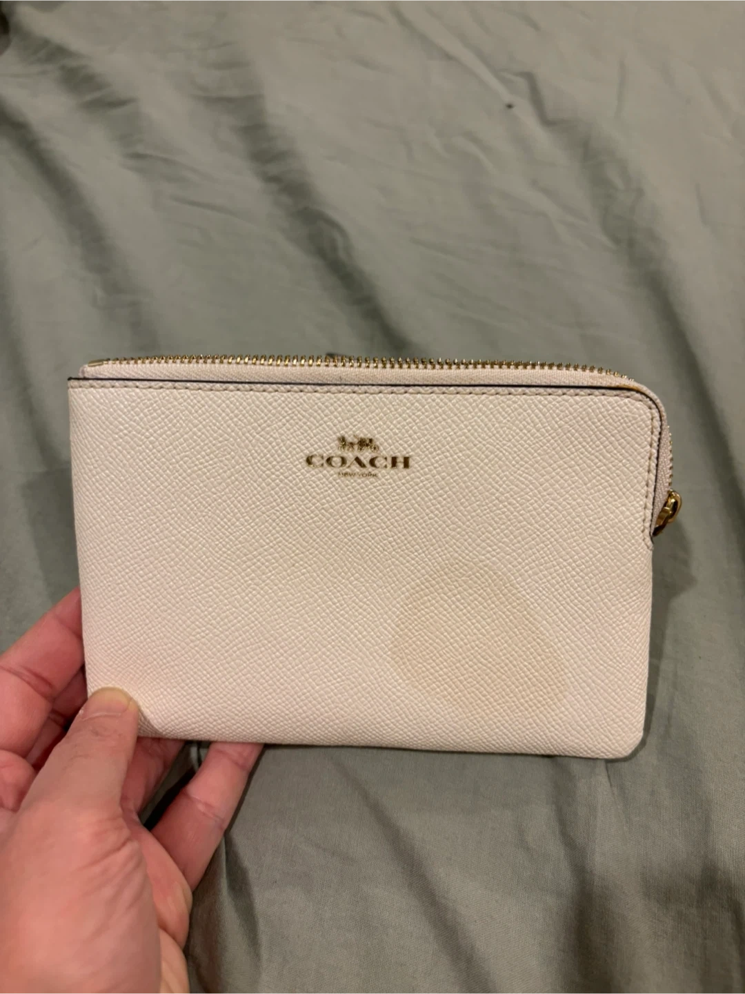 This is a white Coach zip around wallet. It's made of crossgrain leather. This wallet is perfect for keeping your essentials organized.