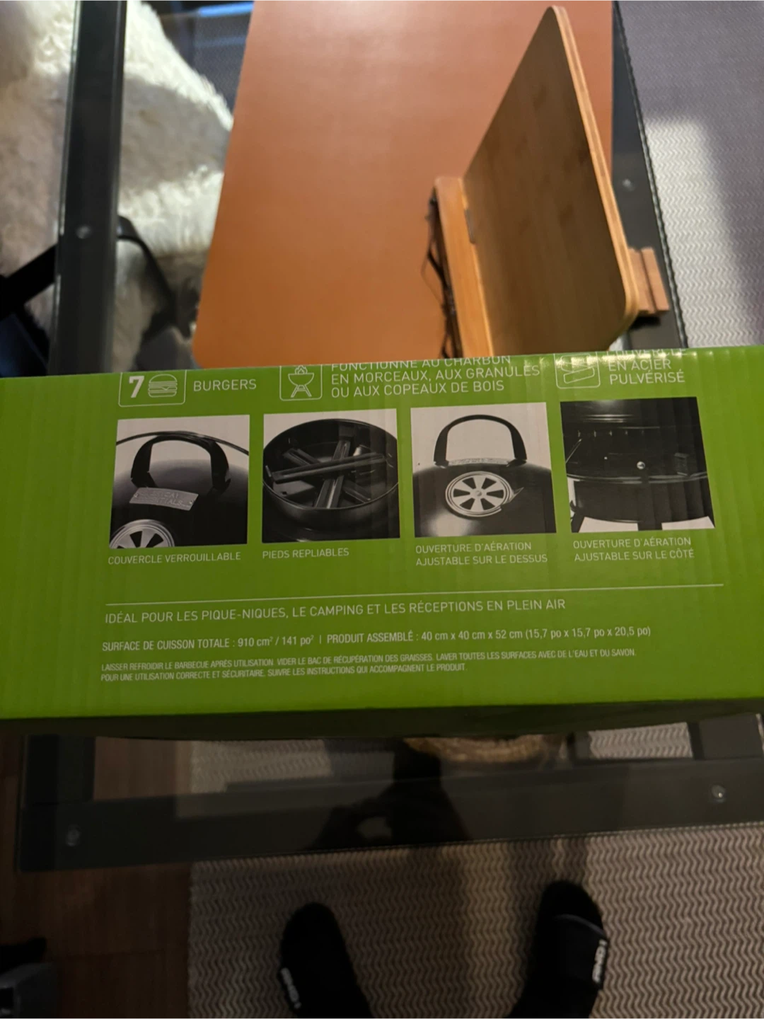 Selling an Everyday Essentials charcoal portable kettle grill! It's still in its box and ready for your next cookout. This grill is perfect for picnics, camping, and outdoor gatherings. It can cook up to 7 burgers at a time! The assembled product measures 40 cm x 40 cm x 52 cm (15.7 po x 15.7 po x 20.5 po)
