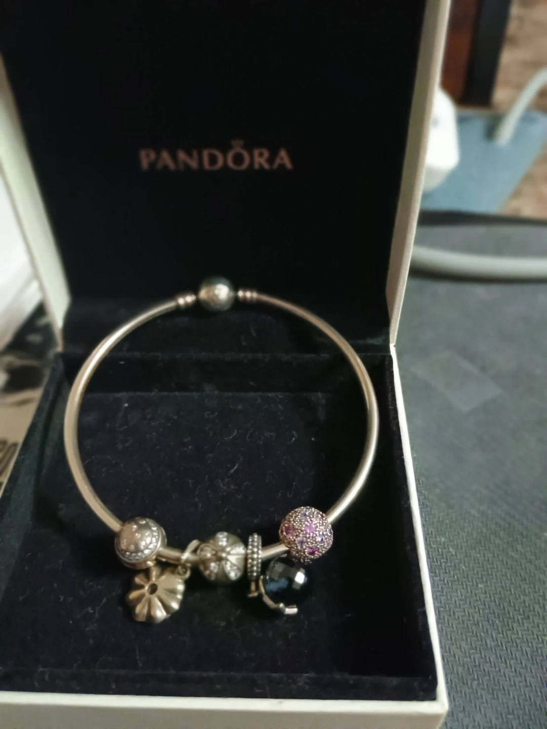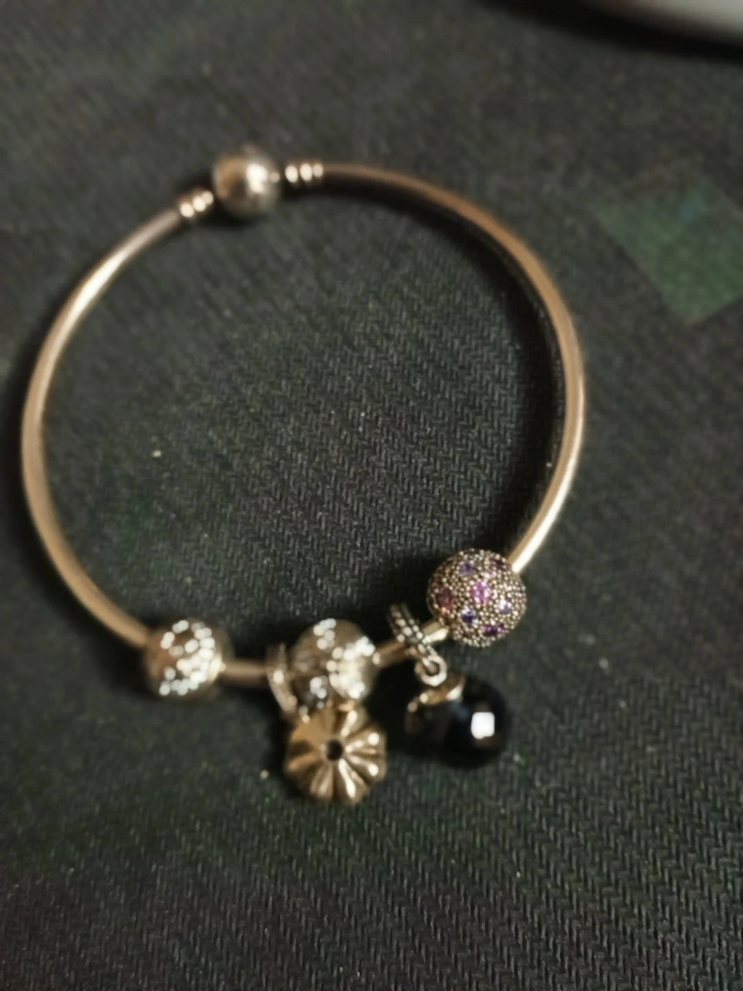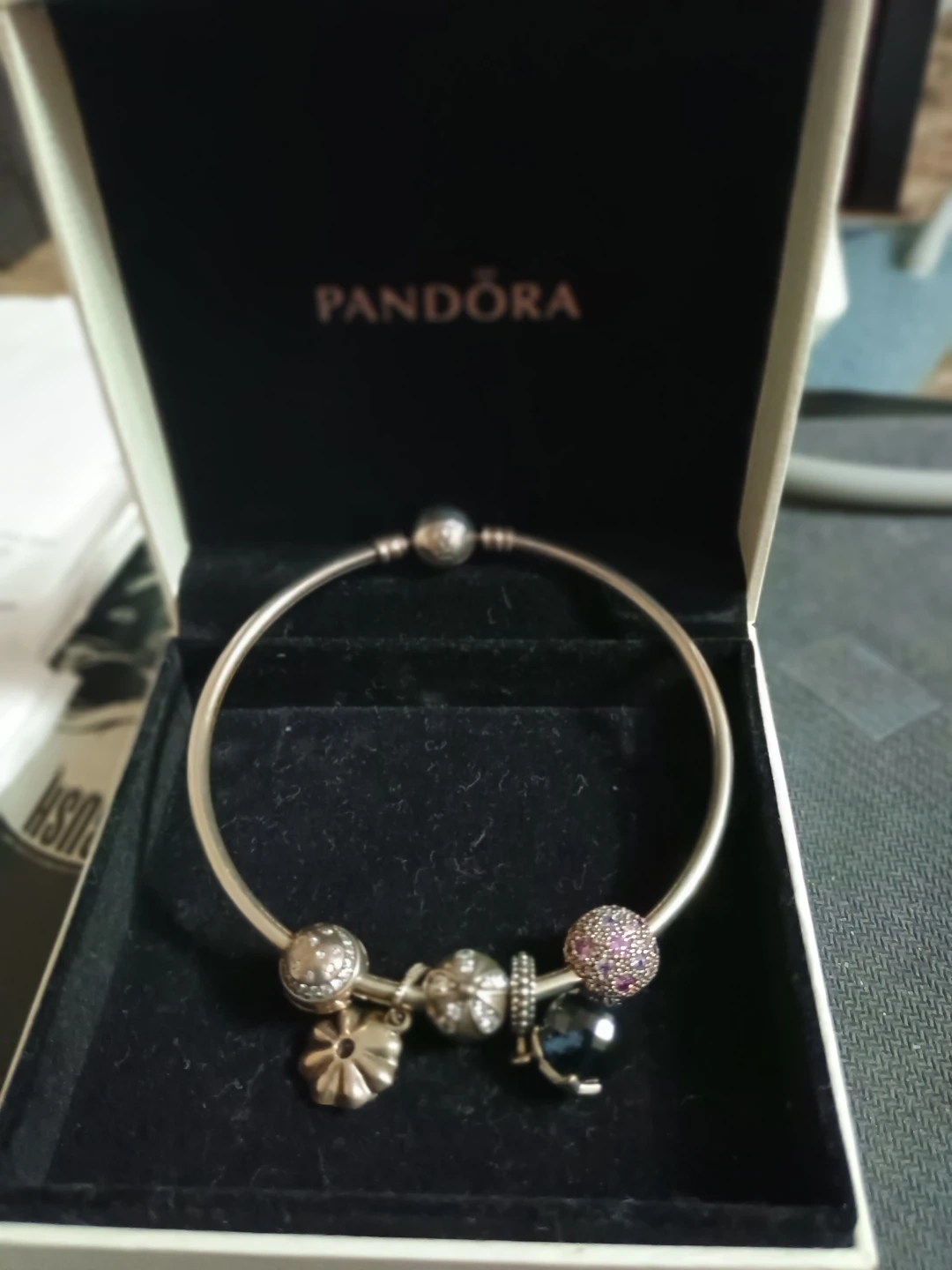 This is a Pandora sterling silver bangle bracelet. It comes with several charms, including a pavé charm with purple stones and a black bead charm. It's presented in its original Pandora box. Perfect for adding a personal touch to your look!