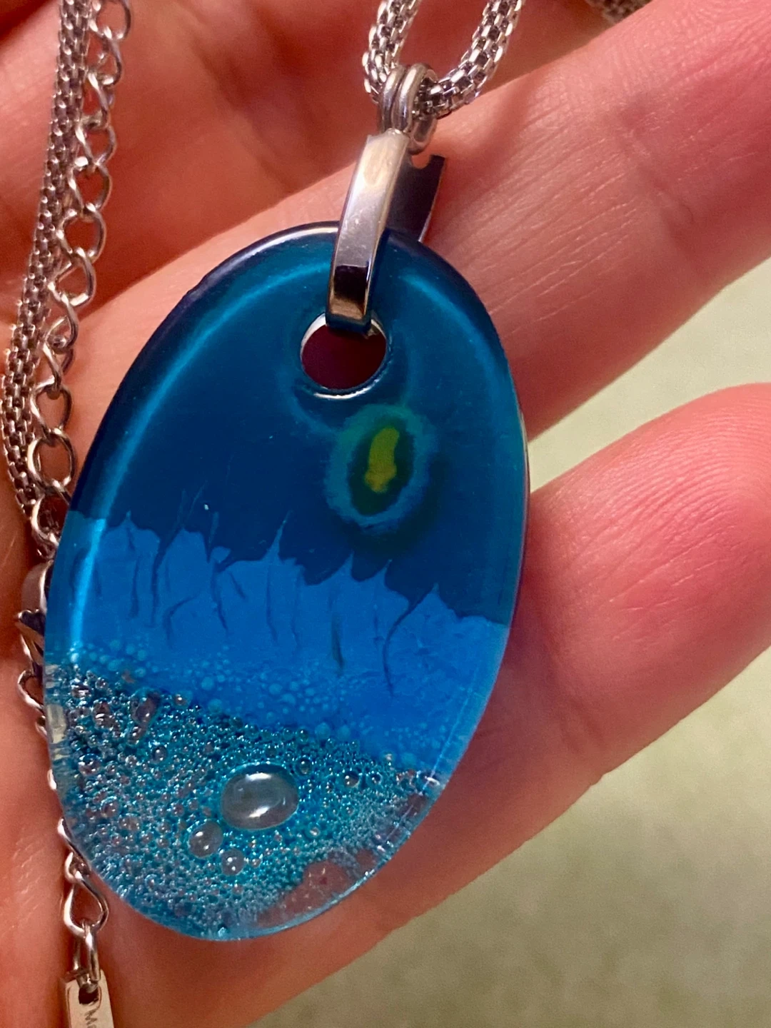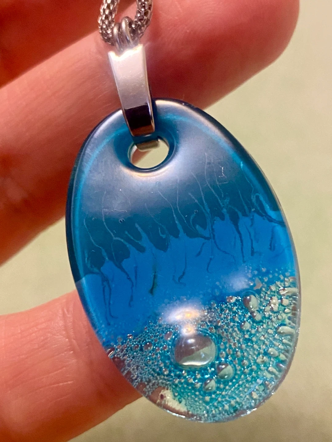 Beautiful blue glass pendant with an ocean wave design. Sterling silver chain. Pendant is oval-shaped and features a vibrant blue with textured "water" and bubble accents. The chain measures approximately 17 inches long.