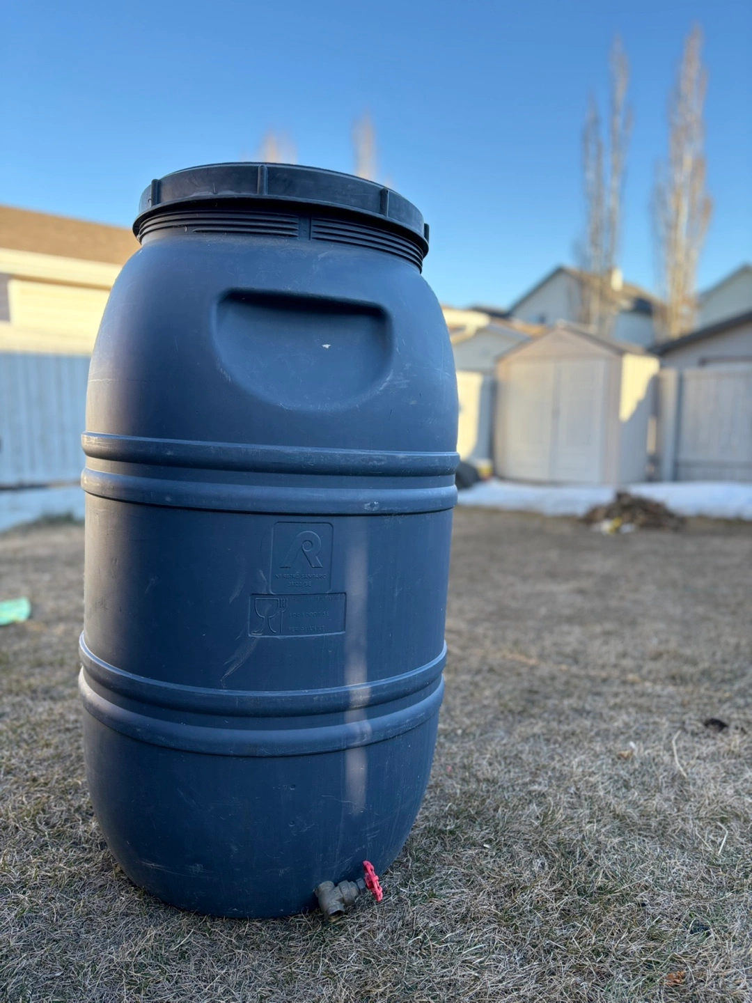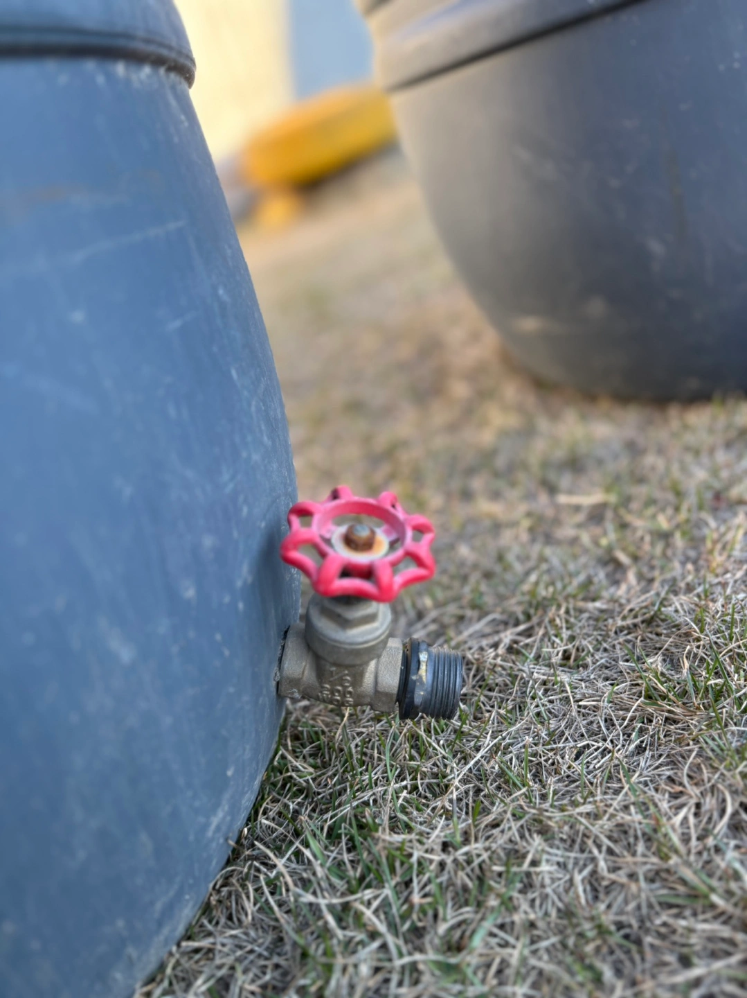 Pair of large rain barrels. Durable plastic construction. Each features a red valve for easy water access. Ideal for collecting rainwater for watering plants.