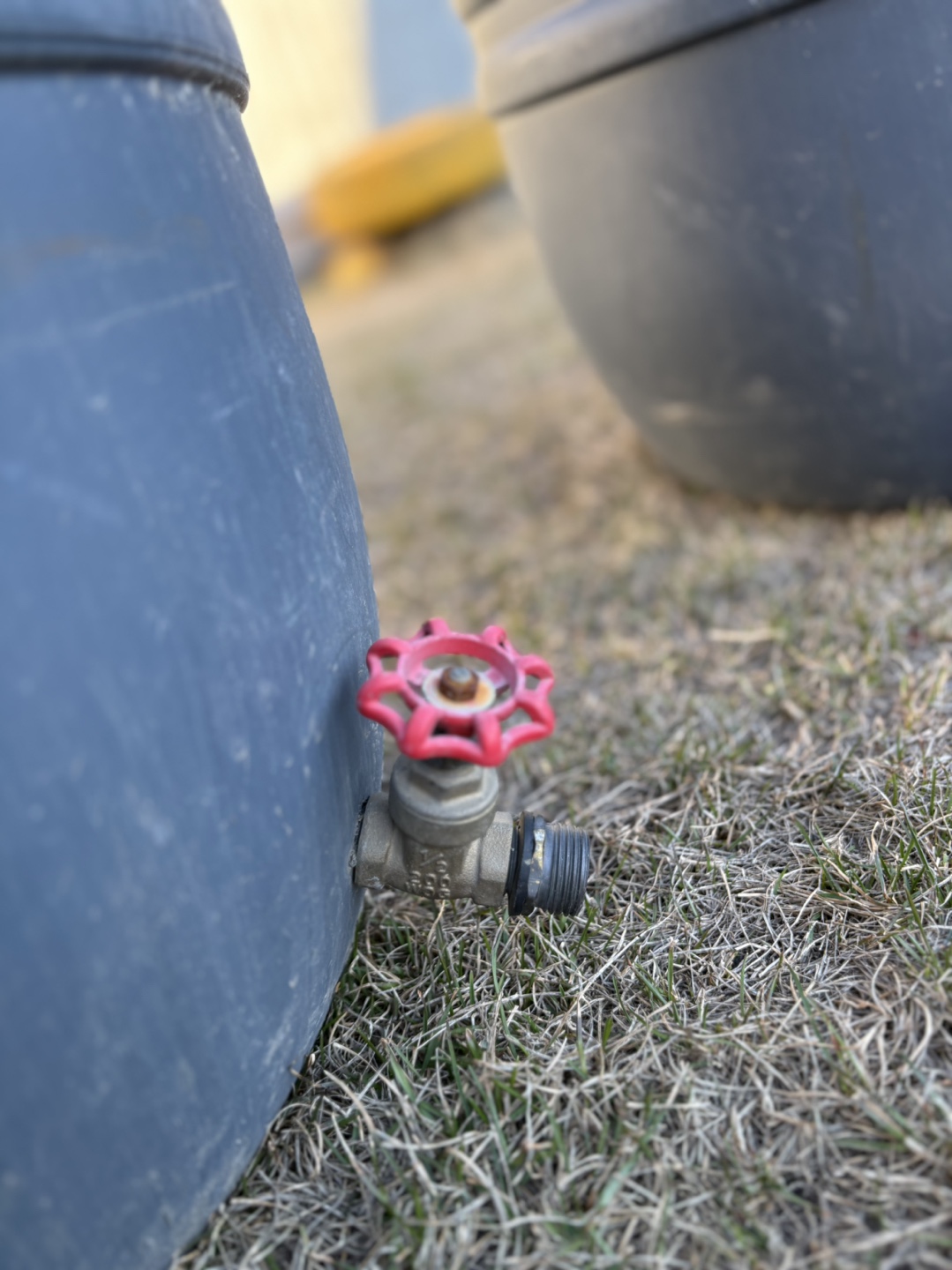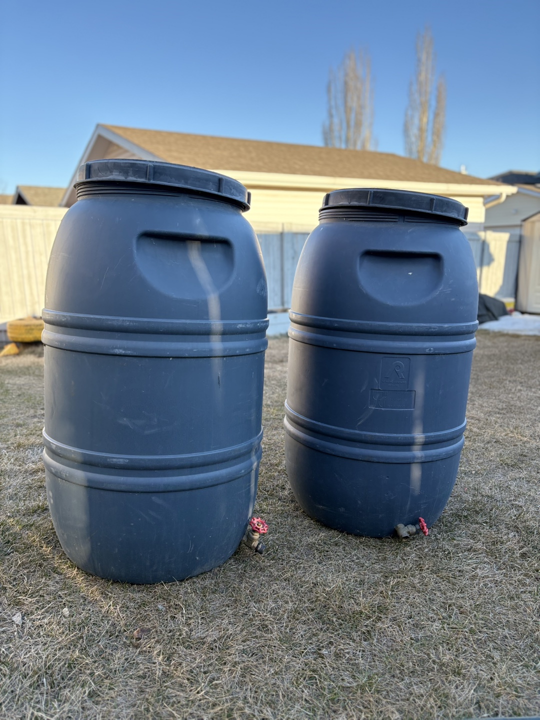 Pair of large rain barrels. Durable plastic construction. Each features a red valve for easy water access. Ideal for collecting rainwater for watering plants.