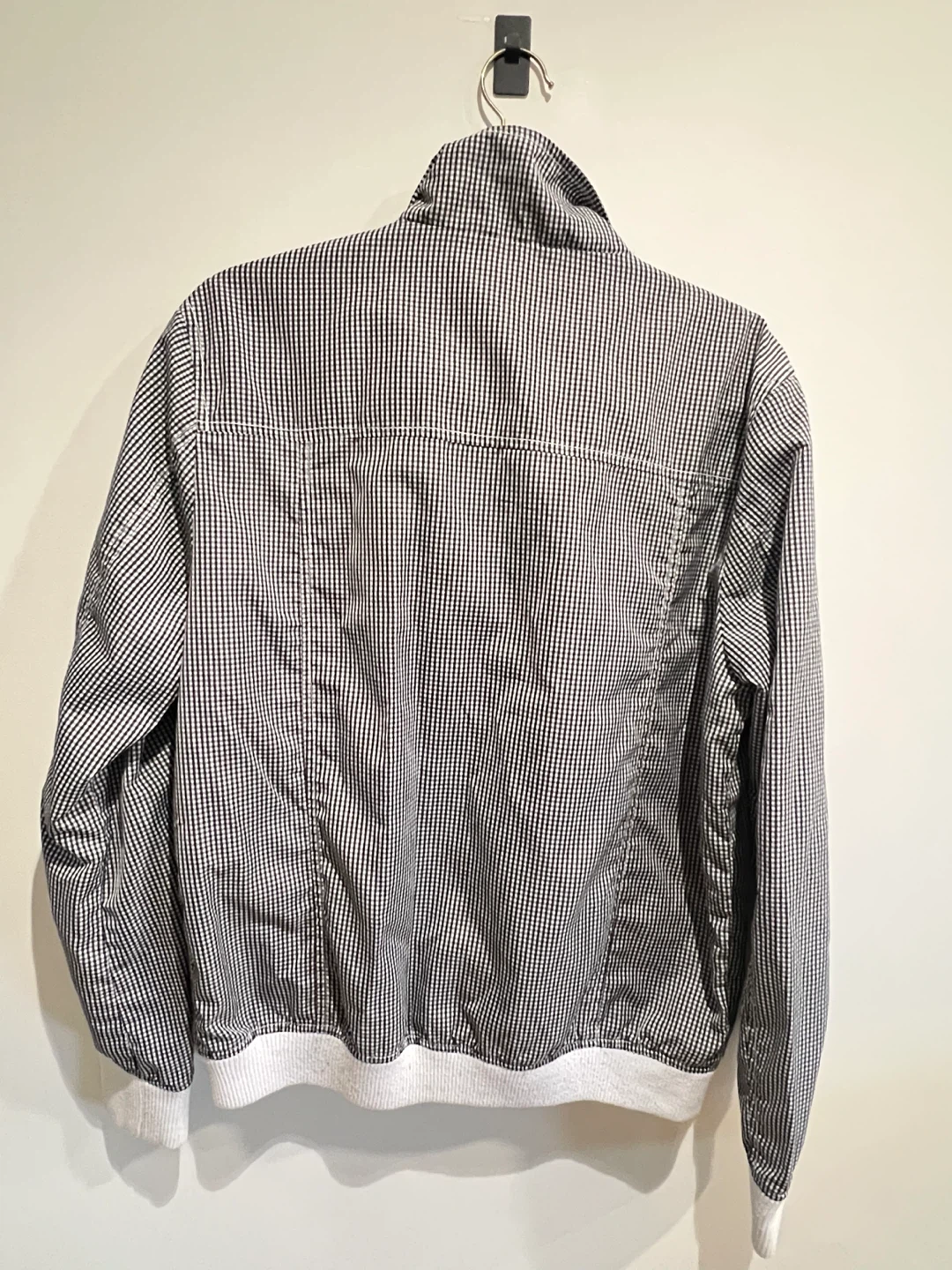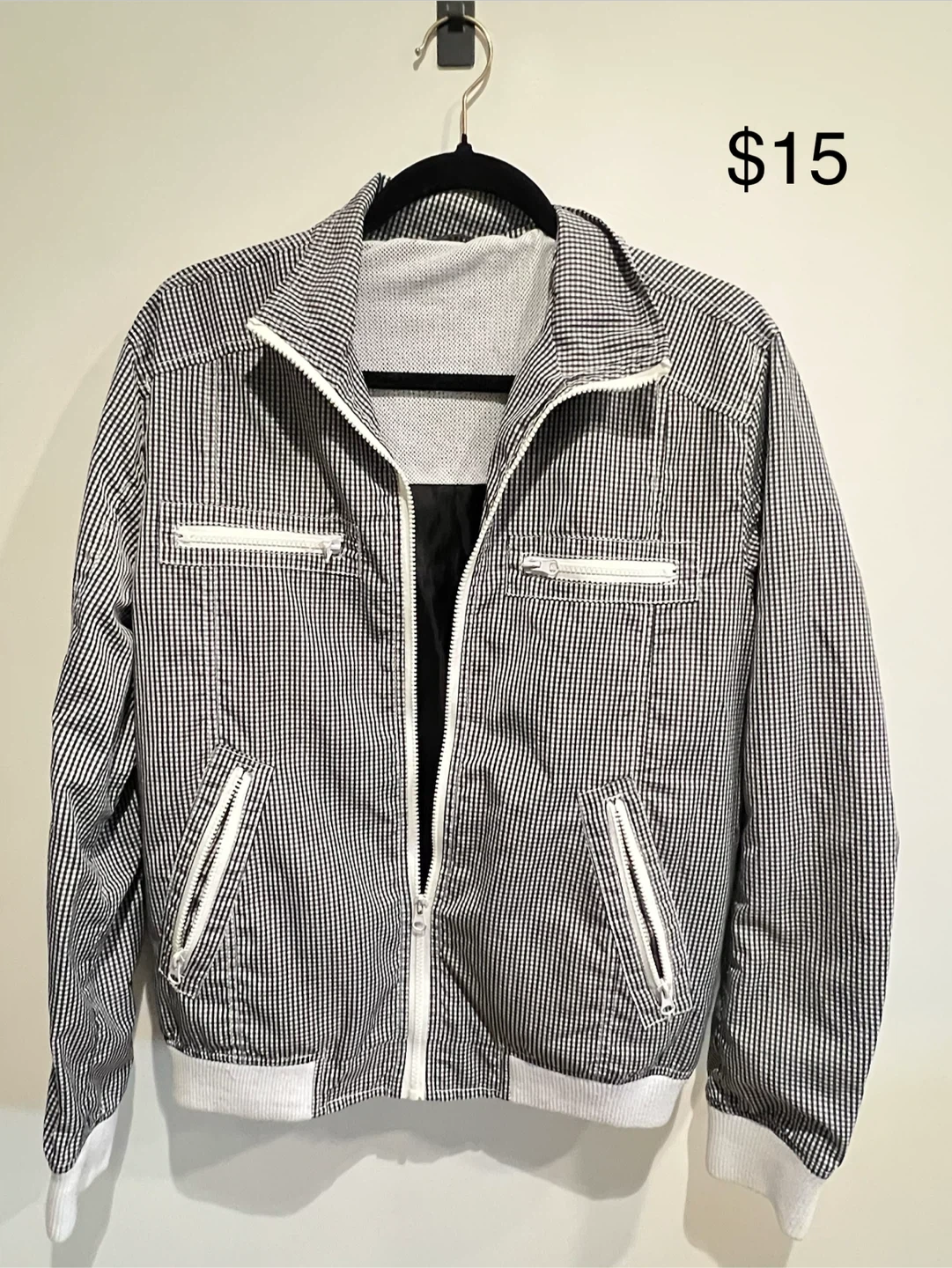 Perry Ellis bomber jacket with a black and white pinstripe pattern. It's a classic zip-up style with white trim. Great for casual wear!