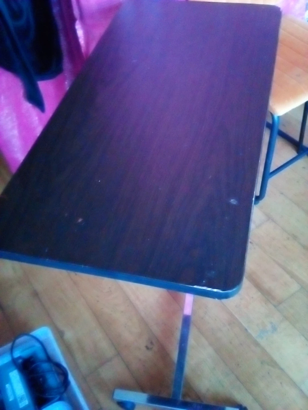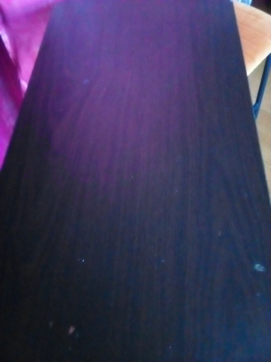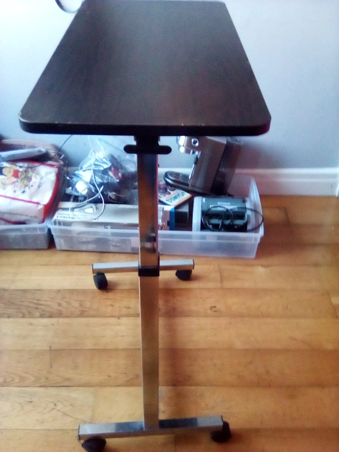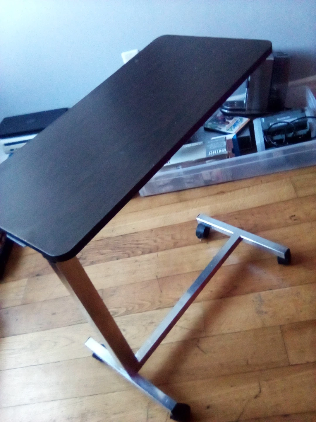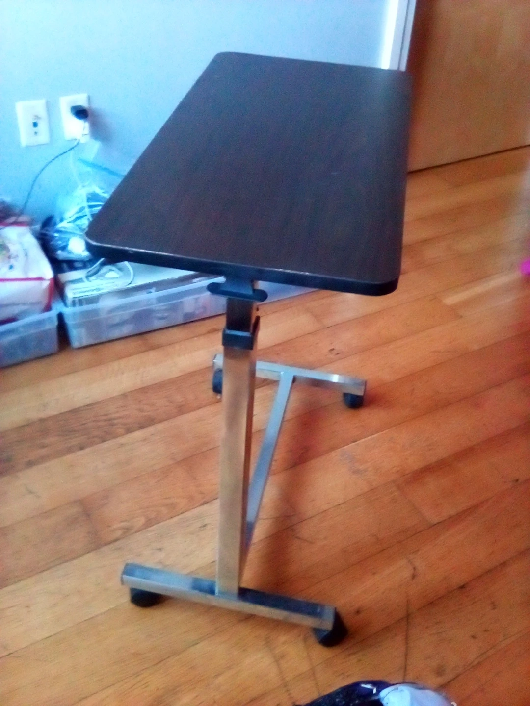 This adjustable bedside table features a dark wood-look tabletop and a metal frame with wheels. It's perfect for use next to a bed or couch. The height is adjustable for your convenience! It's not in perfect condition but it's still in good use