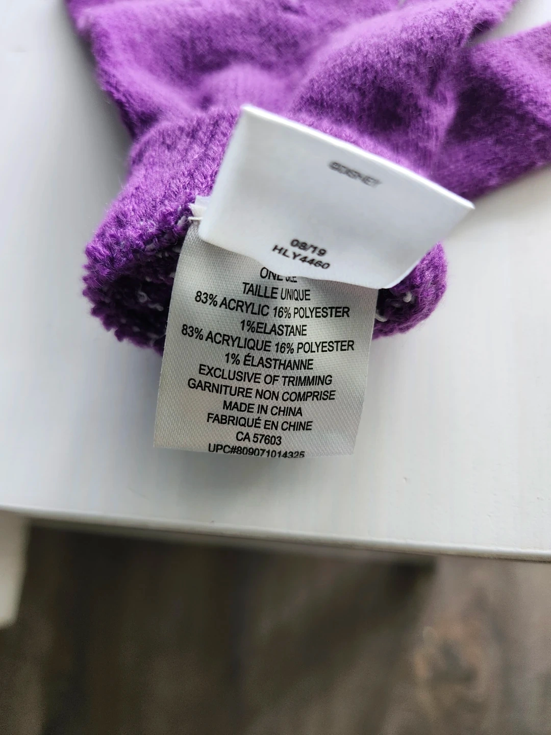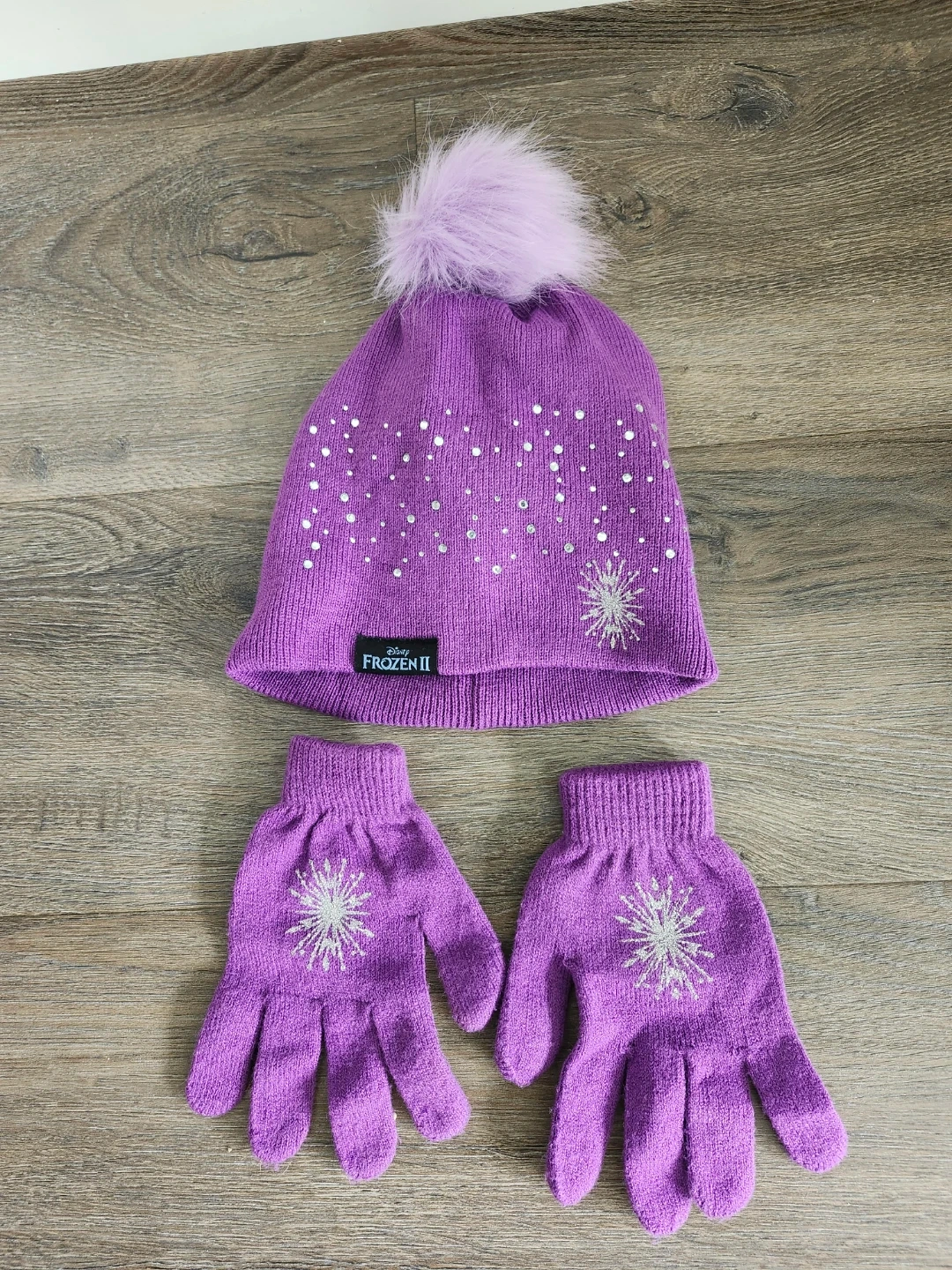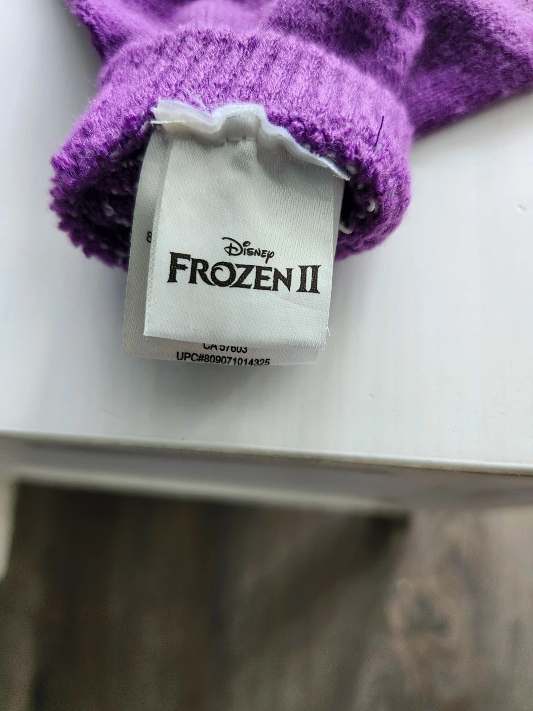 This kids' winter set features a purple pom-pom toque (NEVER WORN) and matching gloves, both adorned with a snowflake design and sparkly accents. It's a one-size-fits-all set, perfect for keeping little ones warm during colder months. The hat is made with 83% acrylic, 16% polyester, and 1% elastane, as are the gloves. This set is suitable for any fan of Frozen II!