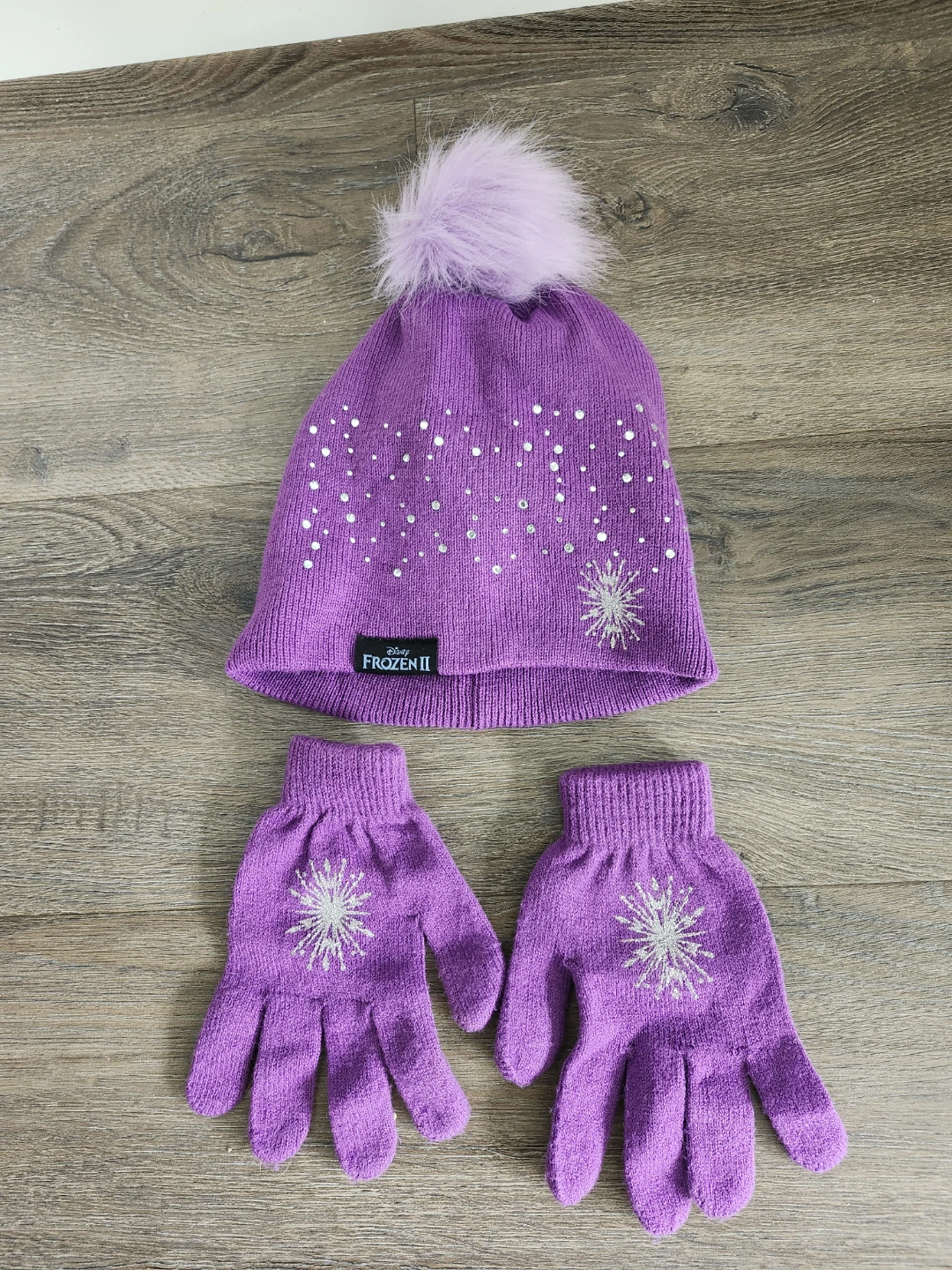 This kids' winter set features a purple pom-pom toque (NEVER WORN) and matching gloves, both adorned with a snowflake design and sparkly accents. It's a one-size-fits-all set, perfect for keeping little ones warm during colder months. The hat is made with 83% acrylic, 16% polyester, and 1% elastane, as are the gloves. This set is suitable for any fan of Frozen II!