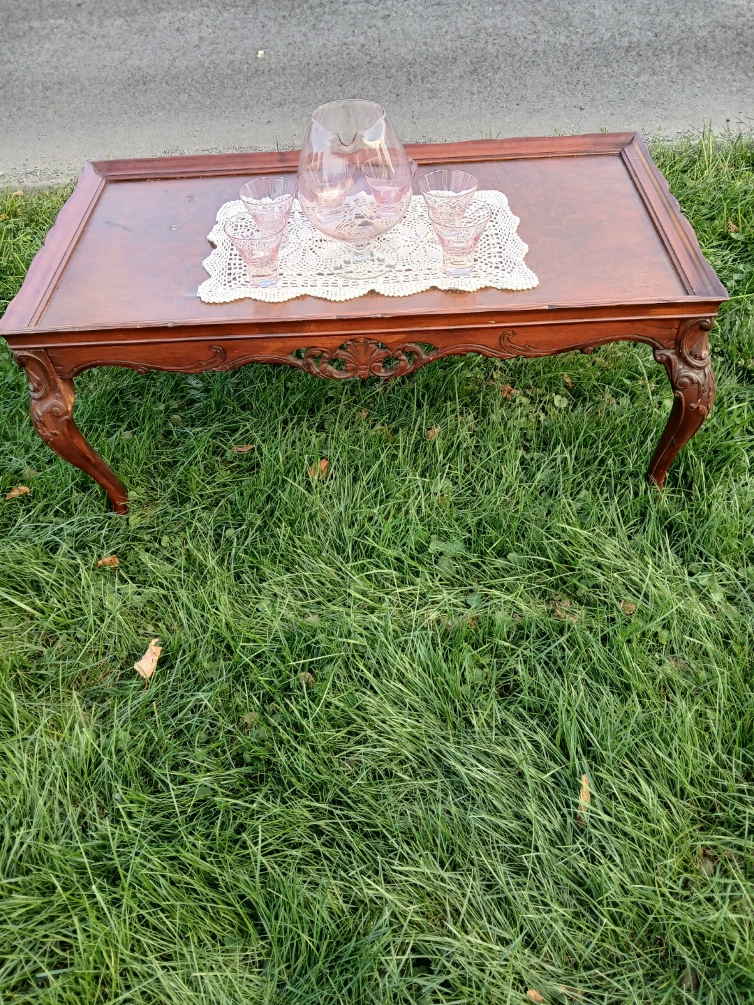 Vintage wooden coffee table with a decorative design on the legs. The table is in very good condition with an antique style. Perfect for adding a touch of elegance to your living room