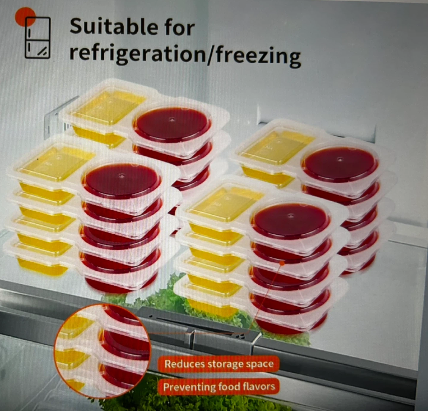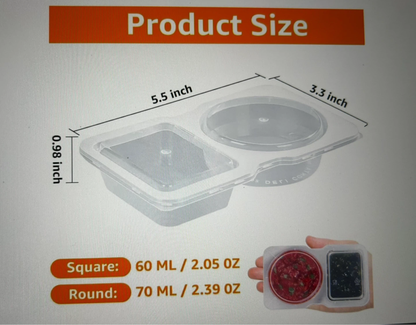 These clear plastic containers are great for packing sauces and dressings. They feature double compartments to keep different items separate. Suitable for refrigeration and freezing!